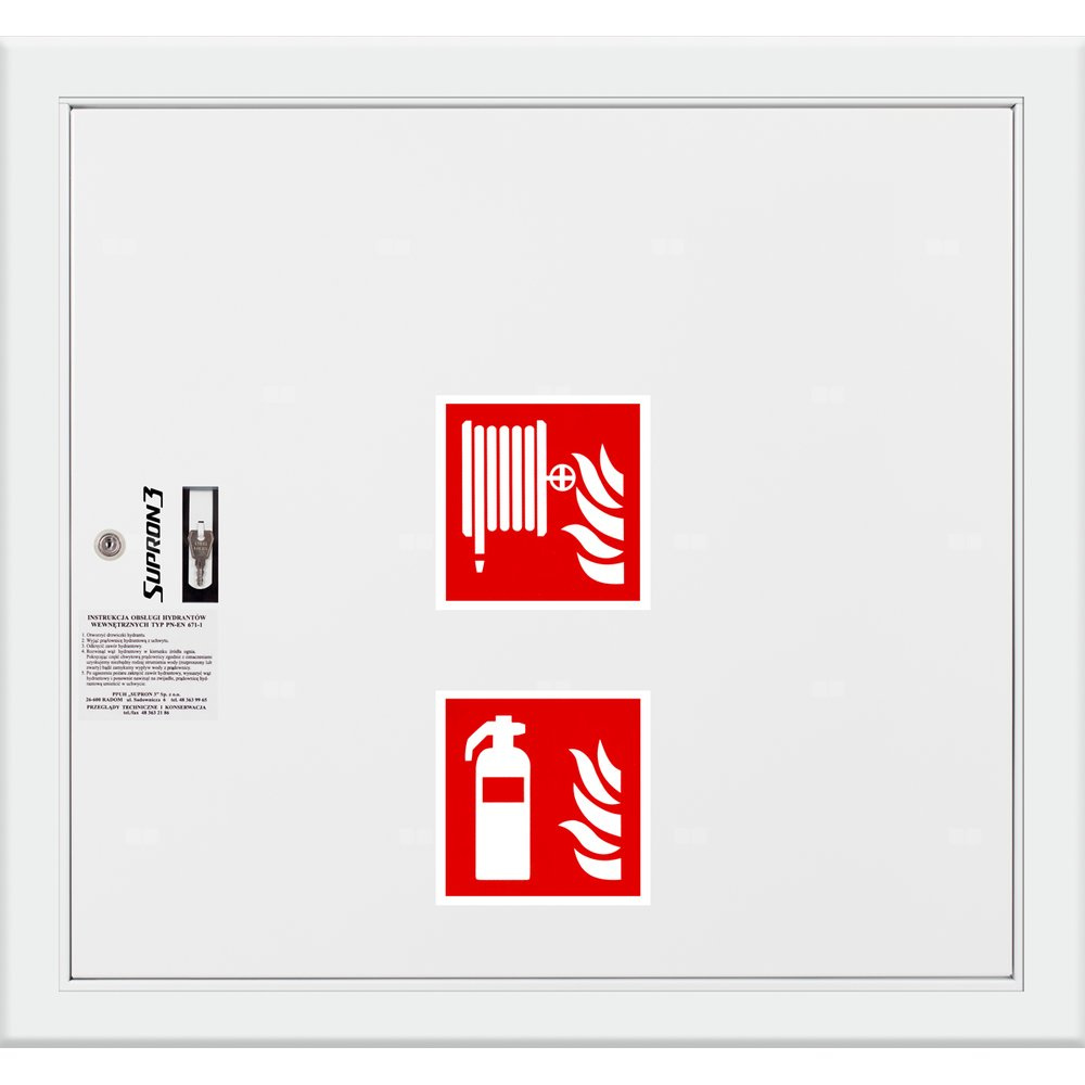 - szafka hydrantowa STANDARD wykonana z blachy czarnej malowanej farbą proszkową poliestrową fasadową typ Facade w kolorze czerwonym (RAL 3000) lub białym (RAL 9003), drzwi pełne; drzwi szafki można otworzyć o 180°