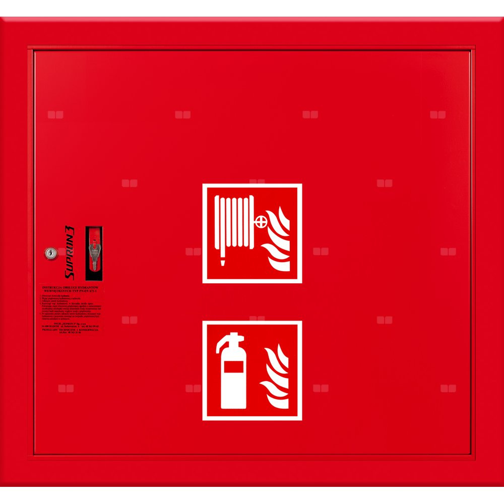 - szafka hydrantowa STANDARD wykonana z blachy czarnej malowanej farbą proszkową poliestrową fasadową typ Facade w kolorze czerwonym (RAL 3000) lub białym (RAL 9003), drzwi pełne; drzwi szafki można otworzyć o 180°