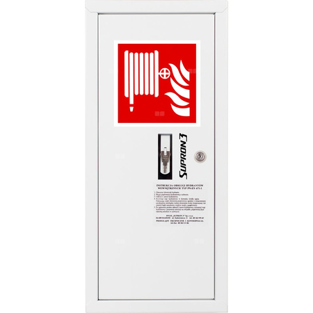 - szafka hydrantowa STANDARD wykonana z blachy czarnej malowanej farbą proszkową poliestrową fasadową typ Facade w kolorze czerwonym (RAL 3000) lub białym (RAL 9003), drzwi pełne; drzwi szafki można otworzyć o 180°