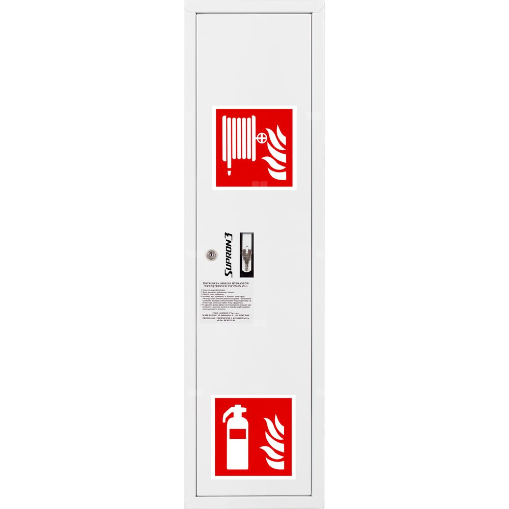 Hydrant DN 52 zawieszany boczny ze zwijadłem, z miejscem na gaśnicę, wąż 20 m, zamek patent, RAL 9003 prawy