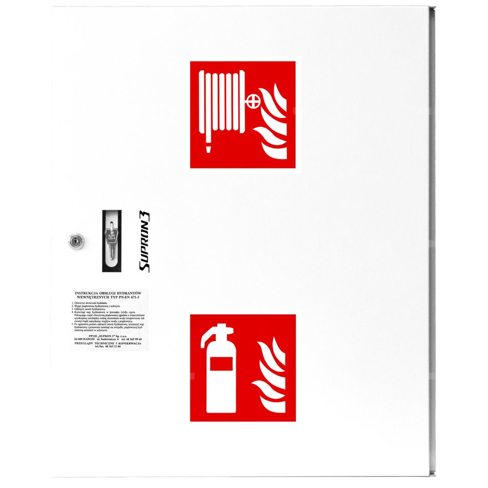 - szafka hydrantowa STANDARD wykonana z blachy czarnej malowanej farbą proszkową poliestrową fasadową typ Facade w kolorze czerwonym (RAL 3000) lub białym (RAL 9003), drzwi pełne; drzwi szafki można otworzyć o 180°