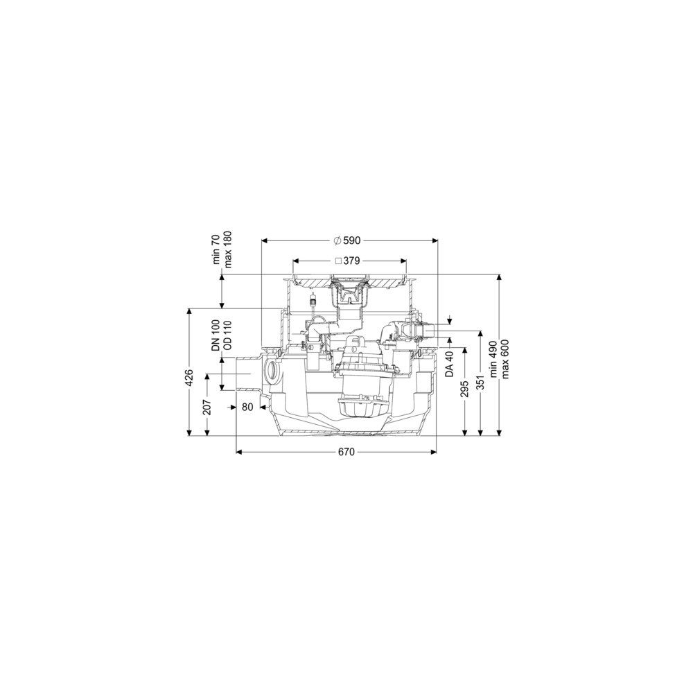 - Odstęp między środkiem rury dopływowej a dnem zbiornika: 207 mm