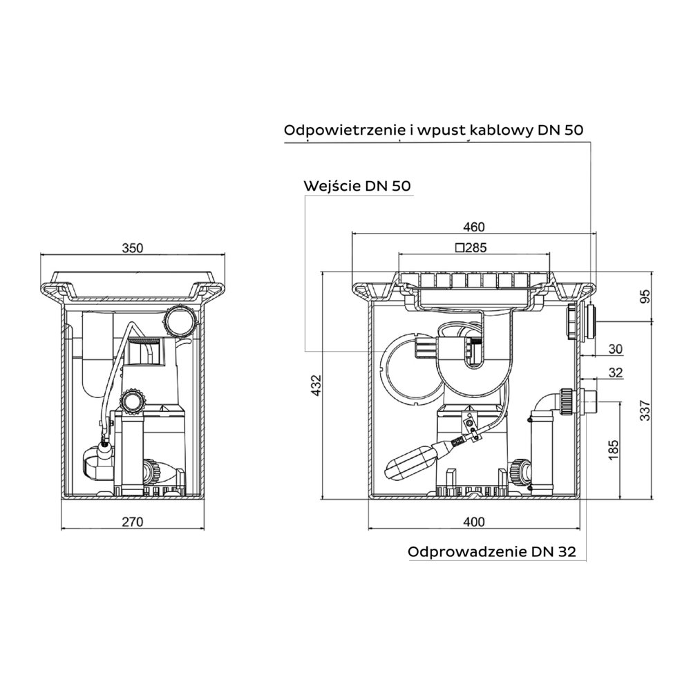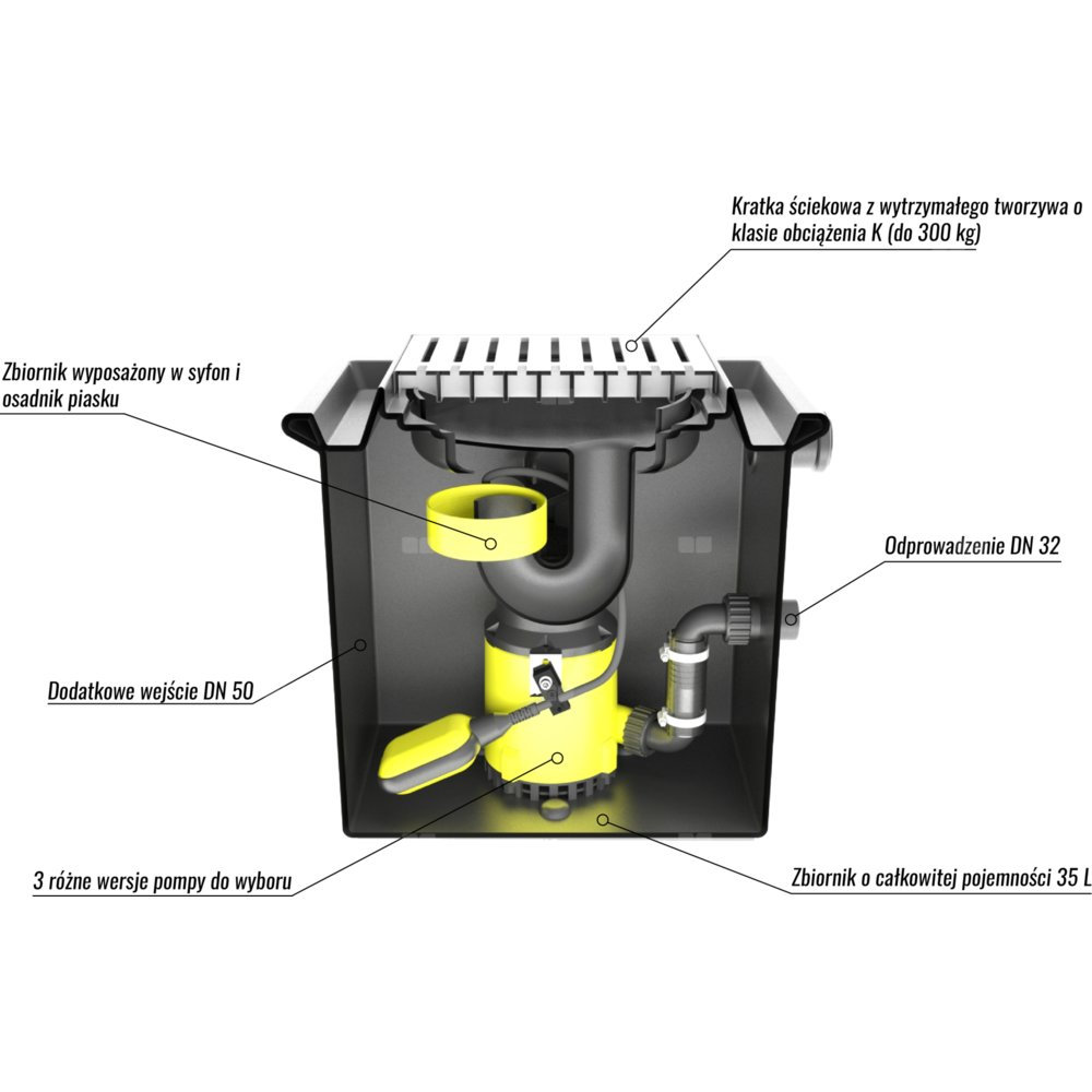 7.5 m ↑ przepompownia do wody szarej z kratką ściekową do montażu w płycie podłogowej. Zbiornik 20 L wyposażony w zatapialną pompę do wody brudnej 300W z włącznikiem pływakowy. Ruszt kratkowy z tworzywa sztucznego, po którym można chodzić, syfon i osadnik piasku. Max. wydajność 7 m3/h