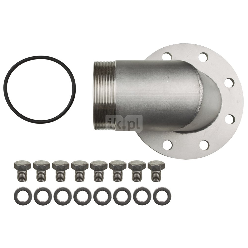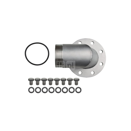 Kolano 90o do montażu do przyłącza tłocznego pompy do bezpośredniego podłączenia węża za pomocą przyłącza, z 1 zestawem osprzętu montażowego