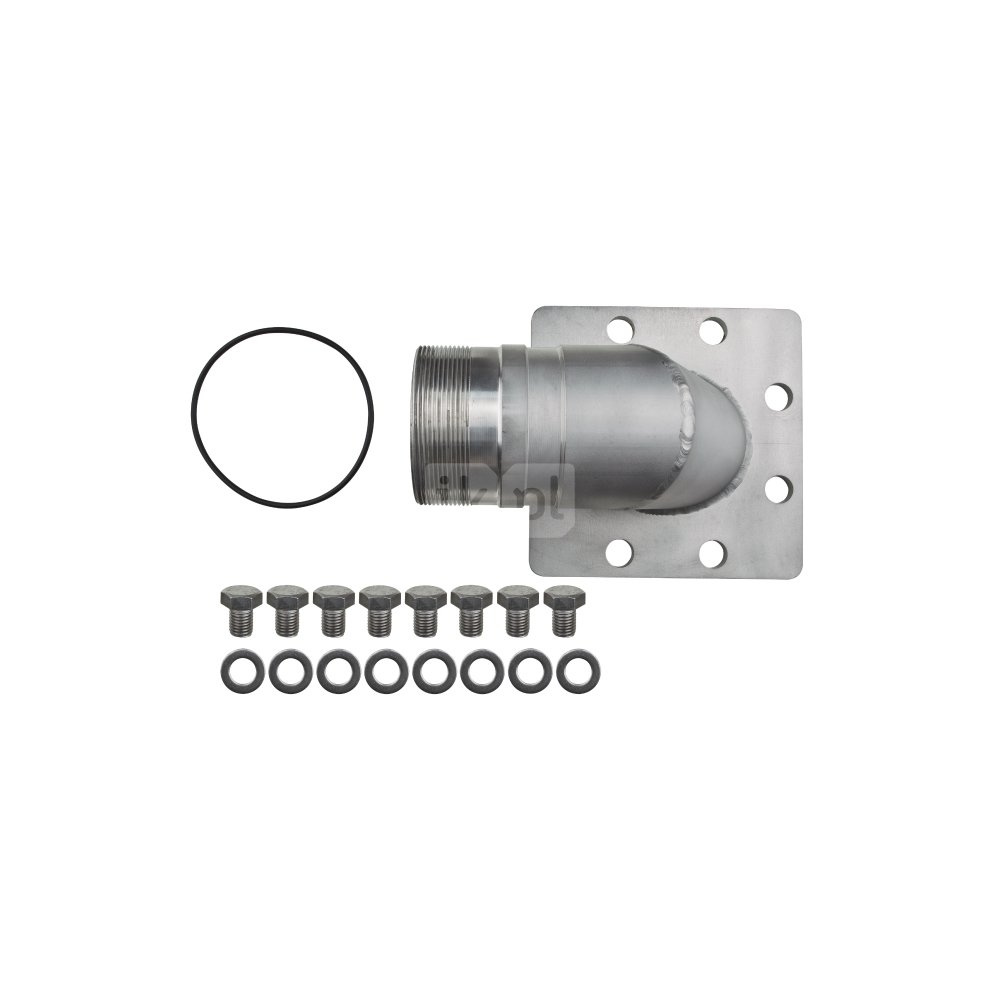 Kolano 90o do montażu do przyłącza tłocznego pompy do bezpośredniego podłączenia węża za pomocą przyłącza, z 1 zestawem osprzętu montażowego