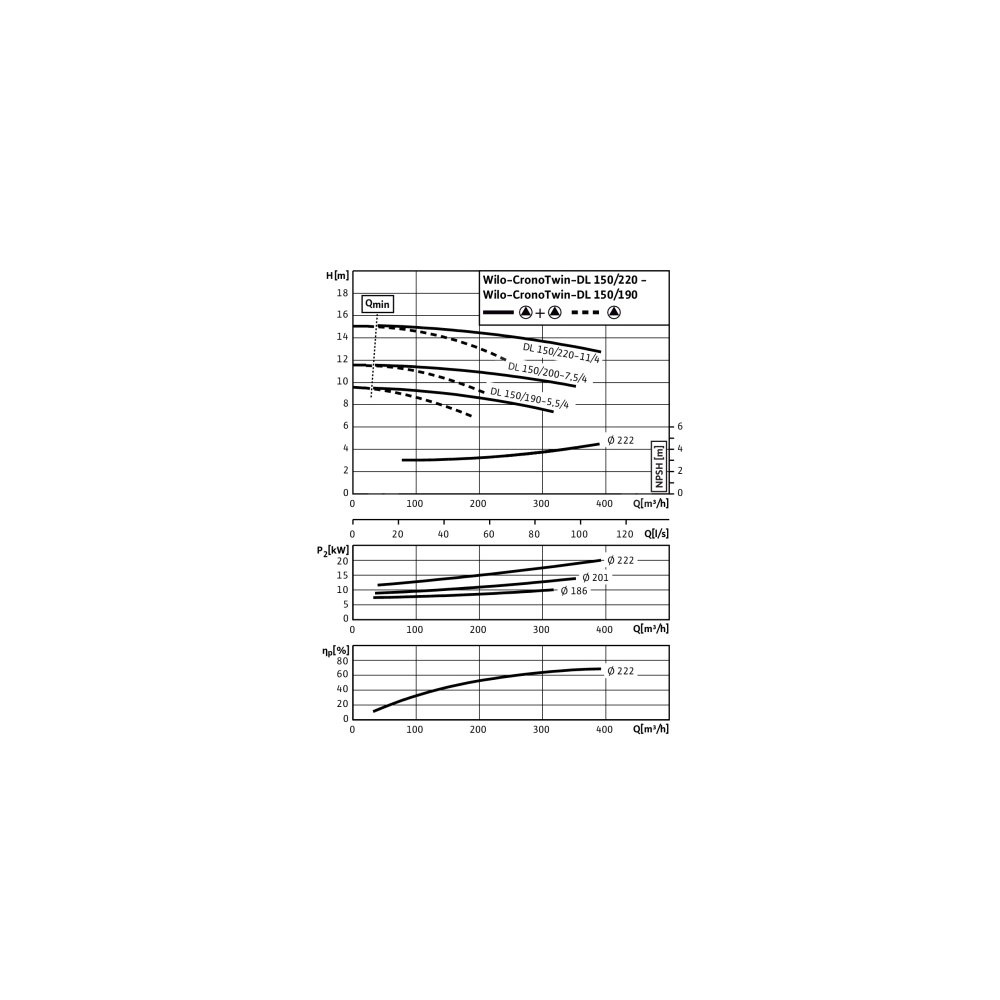 Pompa obiegowa WILO CronoTwin-DL 150/190-5,5/4-IE3 typu in-line z silnikiem znormalizowanym 50 Hz, moc silnika 5.5kW 11.1 A 1450 obr/min, wlot Kołnierz DN 150