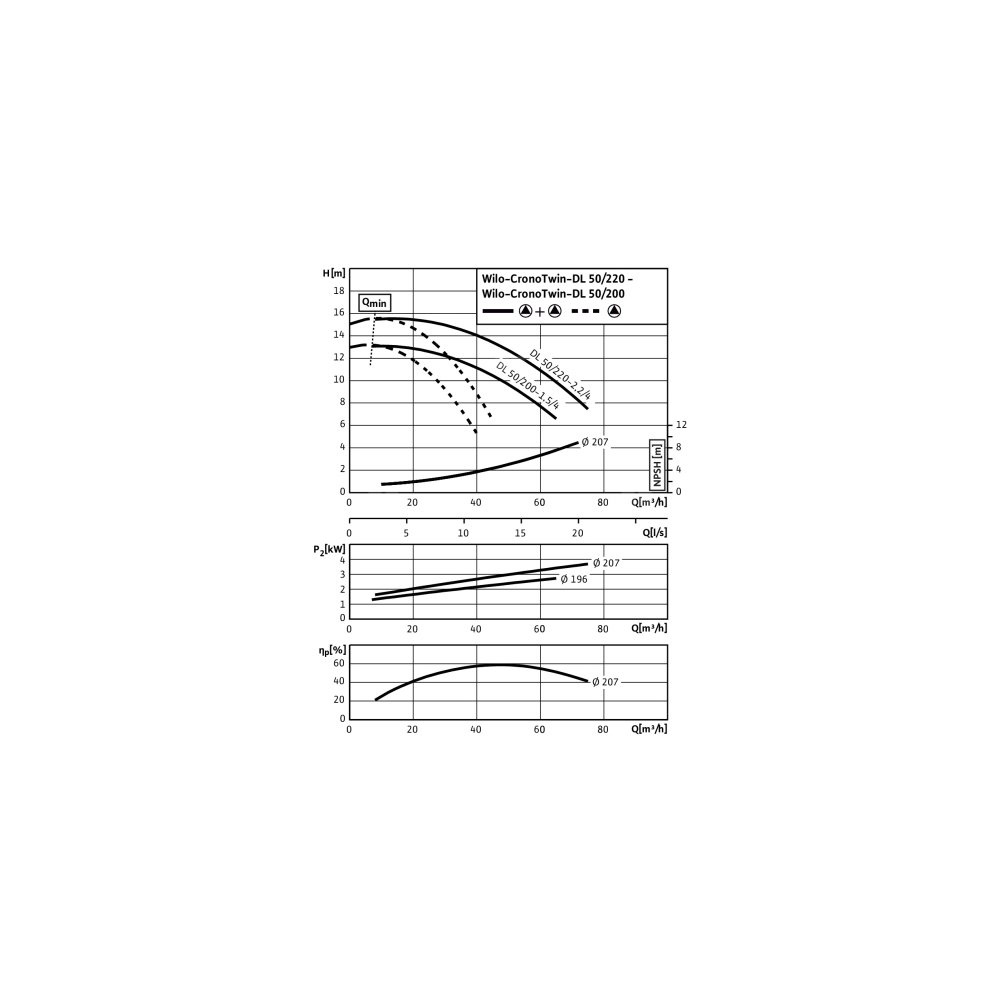 Pompa obiegowa WILO CronoTwin-DL 50/200-1,5/4-IE3 typu in-line z silnikiem znormalizowanym 50 Hz, moc silnika 1.5kW 3.6 A 1450 obr/min, wlot Kołnierz DN 50