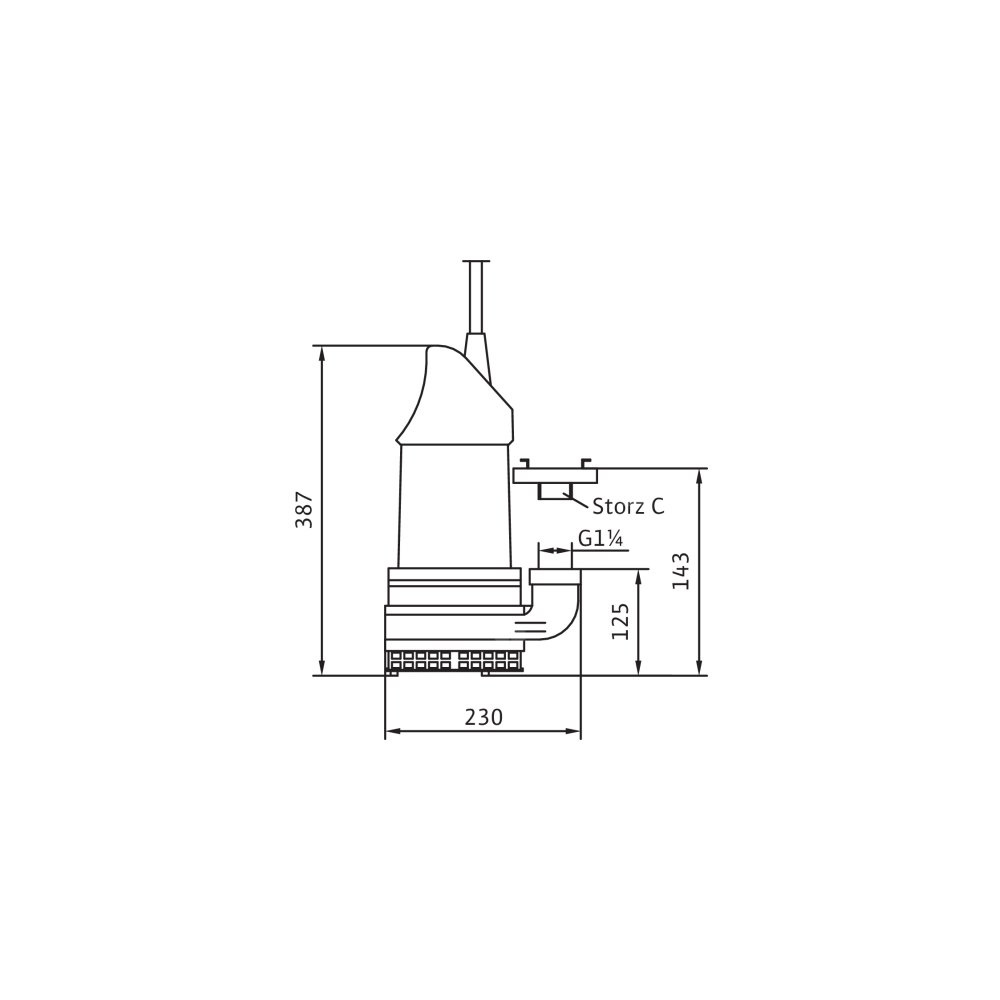 Całkowicie zanurzona pompa zatapialna do wody zanieczyszczonej, pionowe ustawienie mokre, do tłoczenia wody zanieczyszczonej i zawierającej piasek Korpus hydrauliczny i wirnik z żeliwa szarego, korpus silnika z aluminium. Przyłącze tłoczne z pionowym odpływem ciśnieniowym i złączem typu Storz. Samochłodzący silnik w wersji na prąd zmienny jednofazowy, z odłączanym kablem zasilającym i wyłącznikiem pływakowym z wtyczką z uziemieniem i kondensatorem roboczym. Do uszczelnienia po stronie medium i silnika służy uszczelnienie mechaniczne. Agregat można stosować w podsysającym trybie pracy bez ograniczeń.