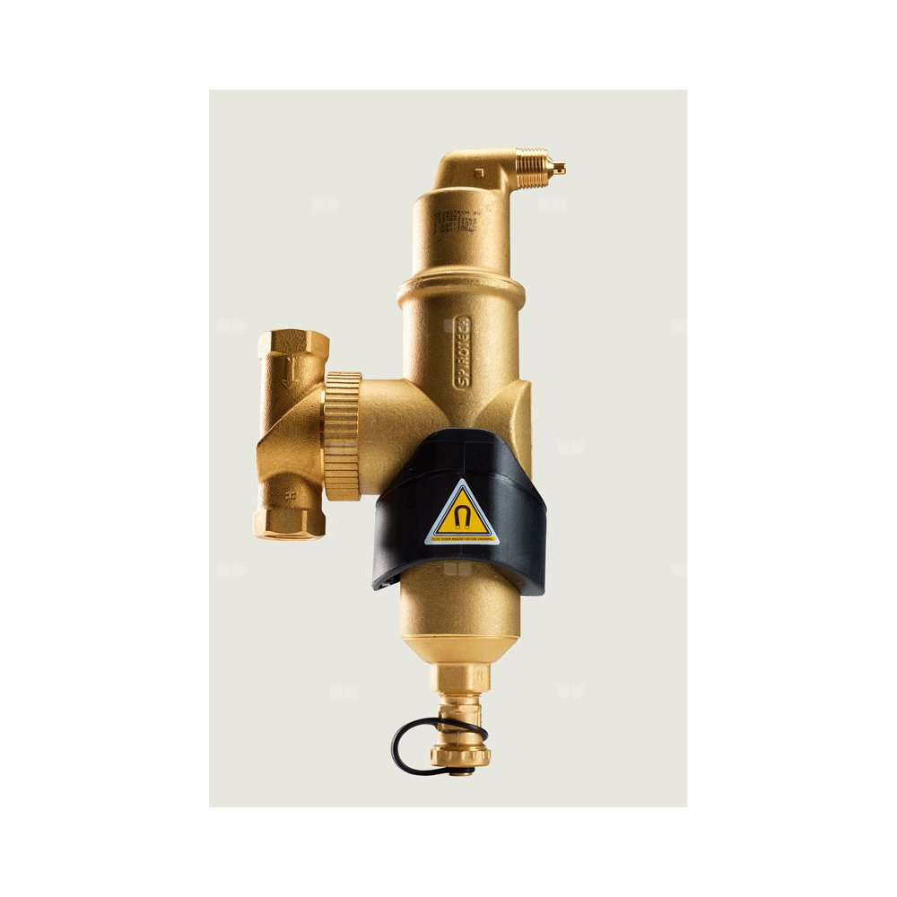 Separator powietrza i zanieczyszczeń SPIROCOMBI. Jest to urządzenie bezobsługowe, pracujące bez siatek i filtrów, zapewniające ciągłą separację powietrza (i gazów) oraz zanieczyszczeń stałych do najdrobniejszych cząstek, utrzymując instalację w stanie uzdatnienia. Wykonanie mosiężne, z zewnętrznym magnesem i obrotowym przyłączem (możliwy montaż na rurociągach poziomych, pionowych, skośnych).