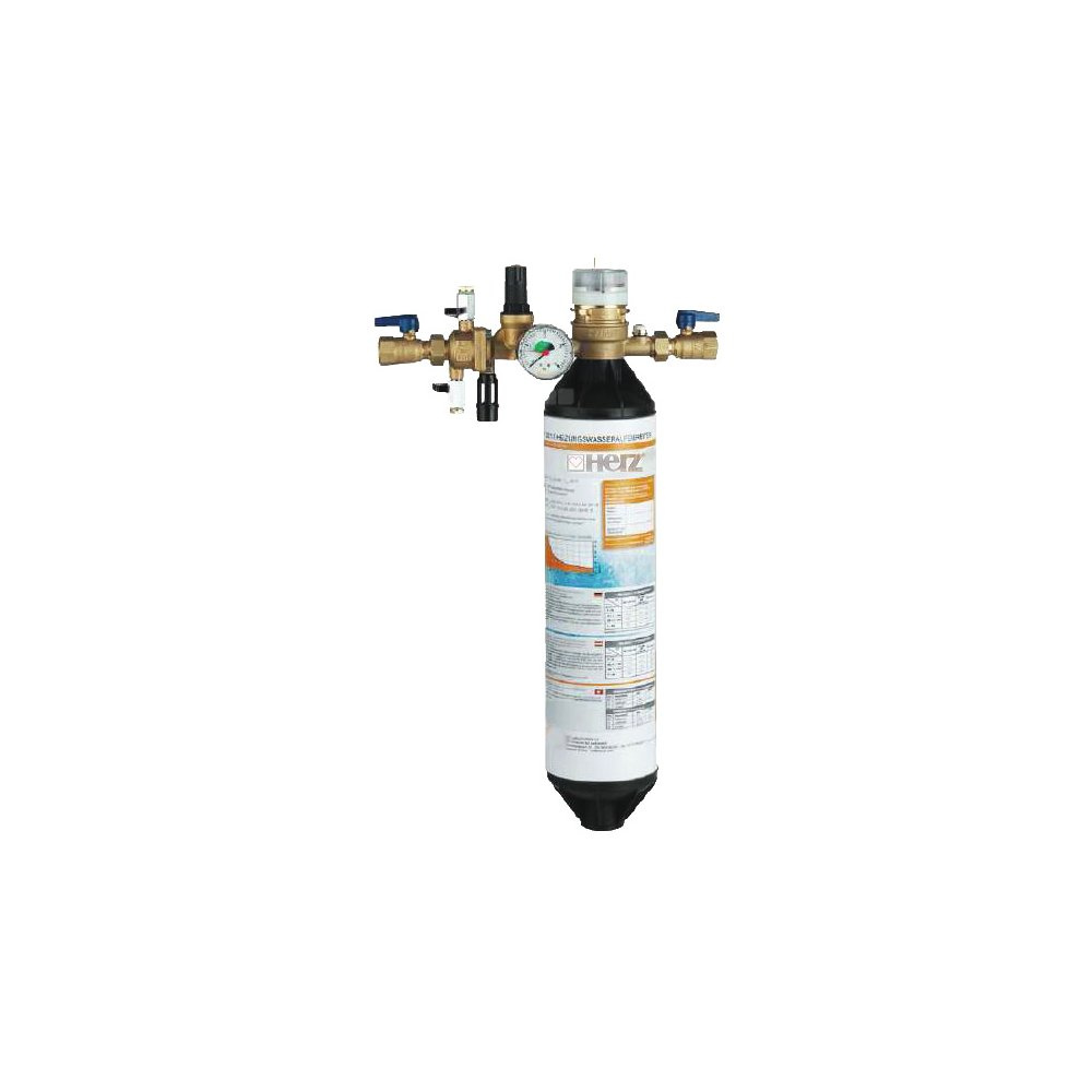 Zespól napełniania wody grzewczej HERZ, składający się z zespołu odcinającego, reduktora ciśnienia, manometru i jednostki napełniającej z wodomierzem, do napełniania instalacji grzewczej, zgodnie z VDI2035 i ÖNORM H5195. Poprzez zmieszanie w jonowymiennej żywicy, uzyskuje się wodę w znacznym stopniu zdemineralizowaną i o odpowiedniej wartości PH, między 8,2 a 8,7. Eliminowane są również jony wpływające na korozję jak chlorki i siarczany, dzięki czemu uzyskuje się ochronę antykorozyjna bez chemicznych inhibitorów. Korpus z mosiądzu kutego. Ciśnienie nominalne 6 bar. Temperatur maks. 60 °C.