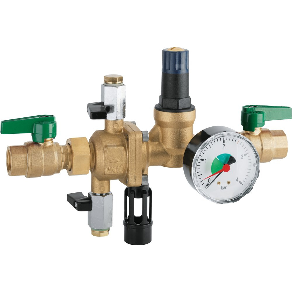 Zespół odcinający HERZ, z funkcją napełniania, typ BA zgodnie z DIN EN 1717, składający się z zespołu odcinającego, zaworów kulowych odcinających kontrolnych i serwisowych, reduktora ciśnienia i manometru, korpus z mosiądzu kutego, zawory kulowe odcinające kontrolne z mosiądzu chromowanego. Ciśnienie nominalne PN 10. Maks. temperatura pracy 65 °C, krótkotrwała 80 °C. Medium: woda.