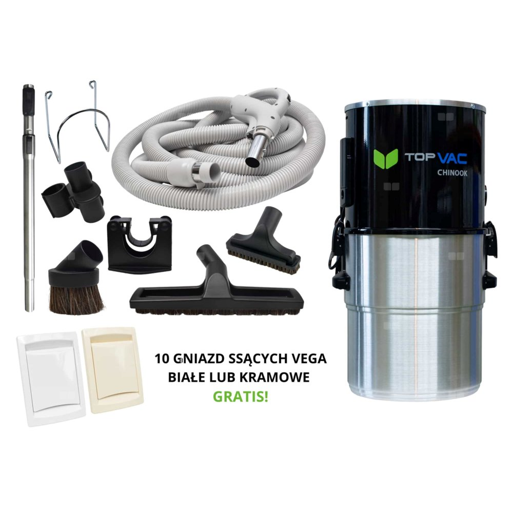 Jednostka centralna TopVac CHINOOK z zestawem do sprzątania z wężem PREMIUM z włącznikiem on/off o dł. 9,1 m i gniazdami VEGA do wyboru