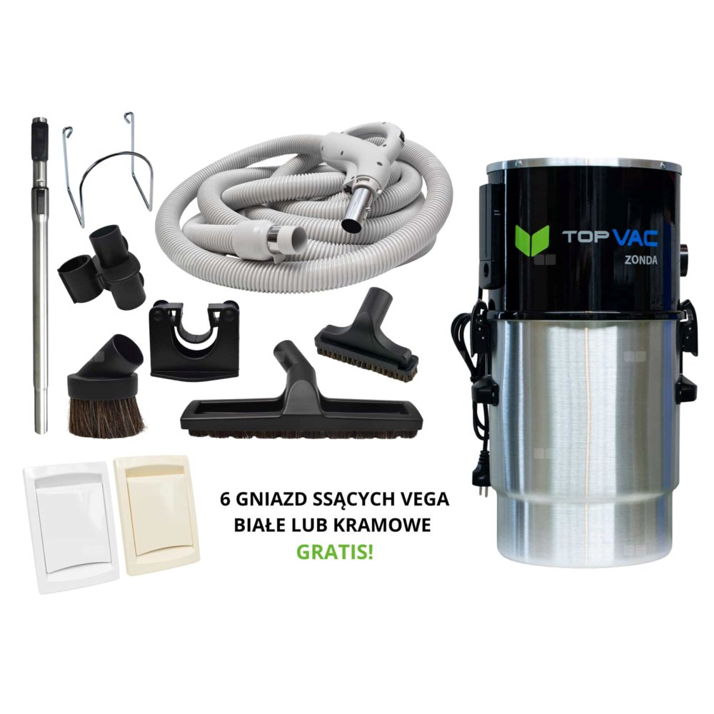 Jednostka centralna TopVac ZONDA z zestawem do sprzątania z wężem PREMIUM z włącznikiem on/off o dł. 9,1 m i gniazdami VEGA do wyboru