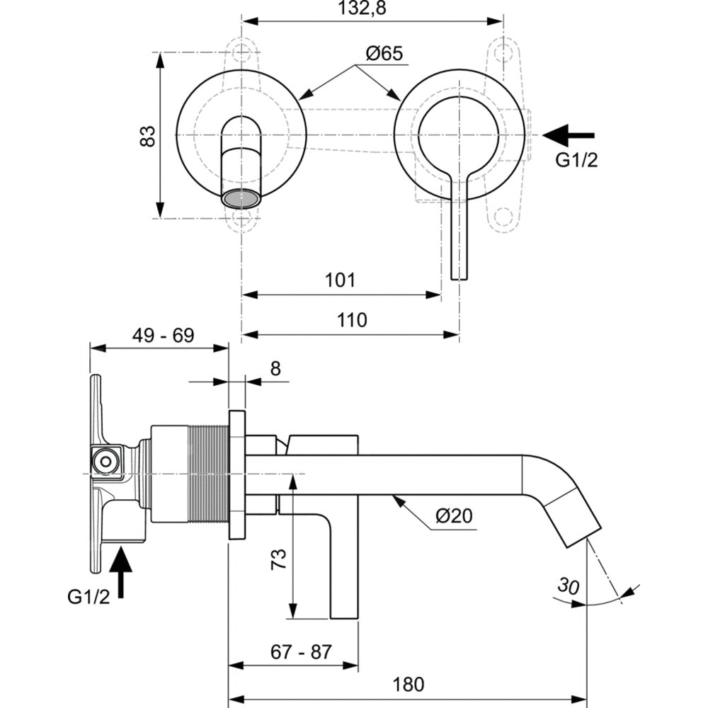 Zestaw montażowy podtynkowej baterii umywalkowej. Głowica ceramiczna 28 mm z ogranicznikiem temperatury wody. Bez funkcji Click. Wylewka rurowa o długości 180 mm. Okrągła, metalowa rozeta z logo Ideal Standard. Metalowy uchwyt z logo Ideal Standard bez oznaczeń. Aerator typu Caché M16,5x1 z ogranicznikiem przepływu wody do 5 l/min. Do skompletowania z elementem montażowym A1313NU.