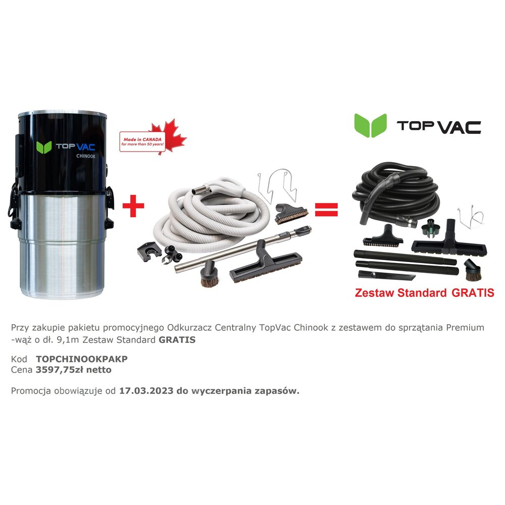 Odkurzacz centralny TopVac Chinook polecany jest do domów o max powierzchni 400m2 wraz z instalacją składającą się z max 12 punktów ssących. TopVac Chinook posiada duży i lekki zbiornik na zanieczyszczenia z ergonomicznymi uchwytami oraz wydajny silnik AMETEK Lamb zapewniający optymalną siłę ssania podczas całego okresu użytkowania. Silnik wyposażono w system łagodnego uruchamiania SOFT-START, dzięki czemu wydłuża się jego żywotność. Urządzenie posiada podwójny system filtracji z opcjonalnym wielowarstwowym antyalergicznym workiem jednorazowym o poj. 30l. Zastąpienie zewnętrznego tłumika hałasu wewnętrznymi kanałami wyciszającymi sprawiło, że odkurzacz TopVac Chinook może zostać zamontowana blisko pomieszczeń mieszkalnych, a hałas podczas sprzątania nie będzie przeszkadzał innym domownikom. W przypadku braku możliwości wyprowadzenia wyrzutu powietrza na zewnątrz budynku, rura wylotowa może pozostać w pomieszczeniu, w którym znajduje się odkurzacz. W przypadku tym zaleca się jedynie zastosowanie dodatkowego filtra wylotu HEPA, który rozproszy powietrze wyrzucane przez urządzenie oraz dodatkowo zmniejszy emitowany hałas o około 2dB. Odkurzacz współpracuje z systemem HAH: wąż ssący bez pokrowca o dł. 9,1m – 15,2m, waż ssący z pokrowcem o dl. 9,1m – 12,2m. Wskaźnik LED umieszczony na obudowie informuje użytkownika o aktualnym stanie urządzenia. W komplecie worek jednorazowy oraz gumowe elementy do podłączenia z instalacją PVC. Gwarancja na odkurzacz wynosi 5 lat, istnieje możliwość wydłużenia gwarancji do 10lat.