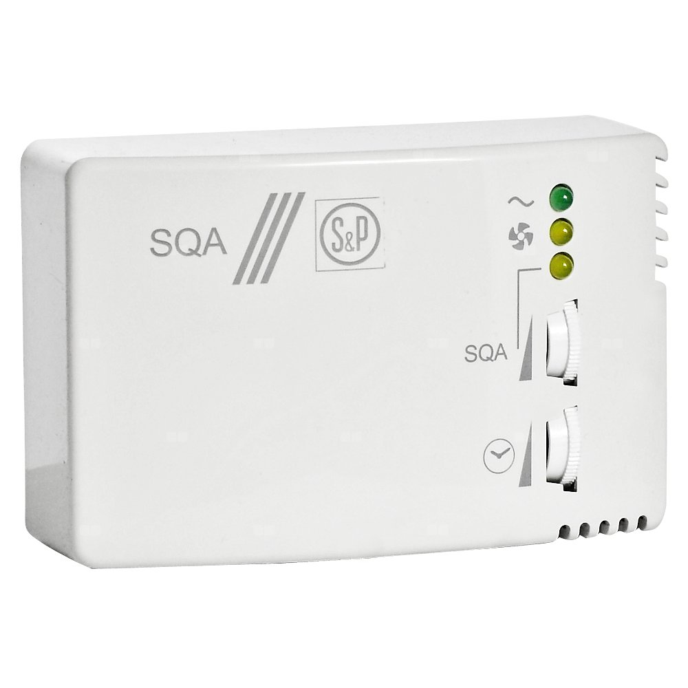 SQA - czujnik zanieczyszczenia powietrza, włącza lub wyłącza wentylator kiedy jakość powietrza spadnie poniżej nastawionego poziomu. Czujnik reaguje na zawieszone w powietrzu pyły, pary, nieprzyjemne zapachy czy dym z papierosów. Czujnik wyposażony jest w opóźnienie czasowe regulowane (1÷25 minut).