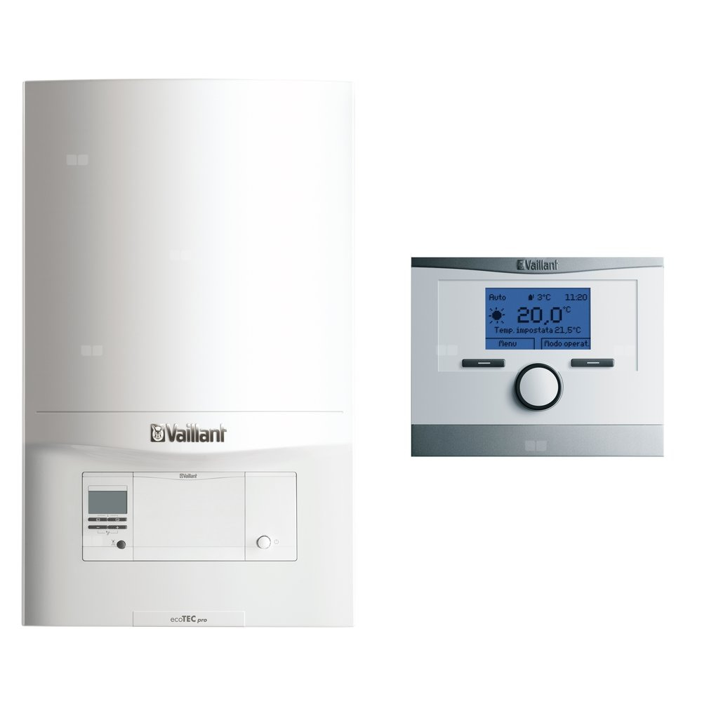 Gazowy, dwufunkcyjny kocioł kondensacyjny Vaillant VCW ecoTEC pro 236/5 z z regulatorem pokojowym calorMATIC 350 lub regulatorem systemowym multiMATIC 700 i opcjonalnie zestawem podstawowym systemu powietrzno-spalinowego szachtowego lub z wyrzutem przez ścianę.