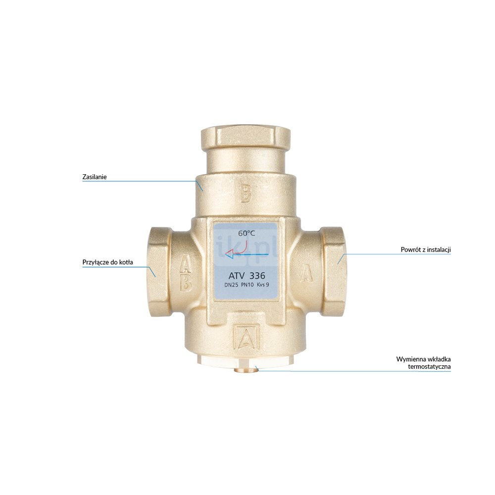 W instalacjach z kotłami stałopalnymi miesza lub rozdziela strumień medium. W przypadku funkcji mieszania ATV zabezpiecza kocioł przed korozją niskotemperaturową na skutek powrotu wody o zbyt niskiej temperaturze. W przypadku funkcji rozdzielania ATV rozdziela medium między powrotem do kotła a zasilaniem instalacji, umożliwiając wygrzanie kotła do odpowiedniej temperatury.