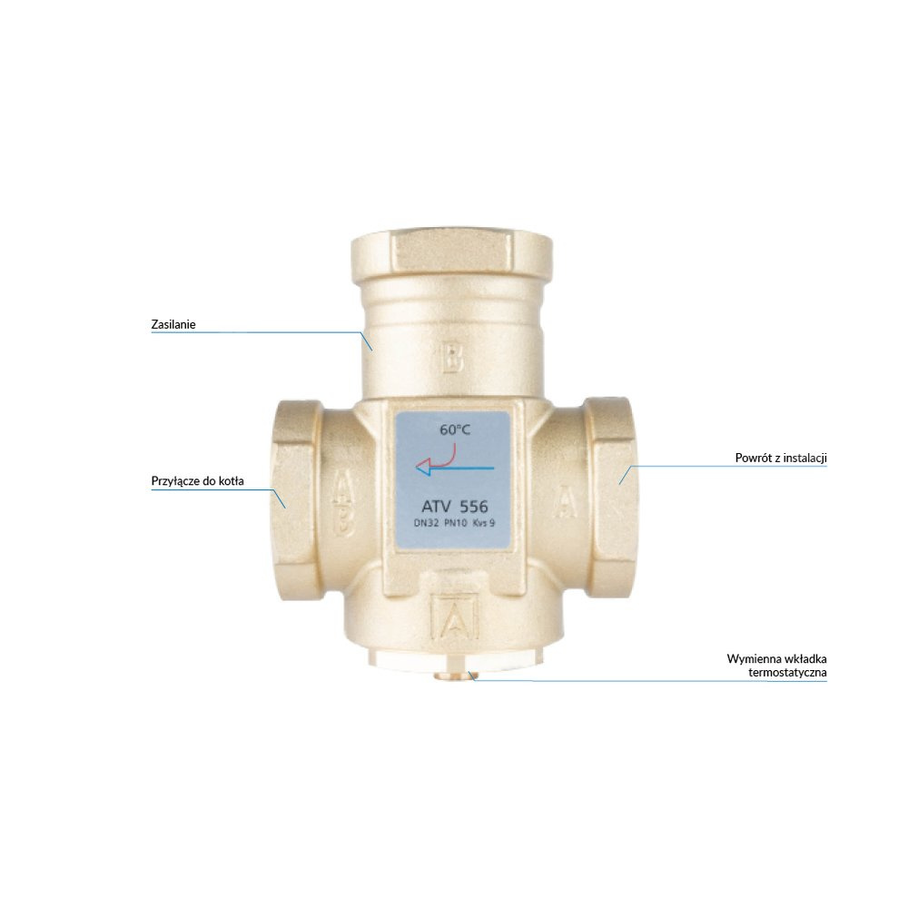 W instalacjach z kotłami stałopalnymi miesza lub rozdziela strumień medium. W przypadku funkcji mieszania ATV zabezpiecza kocioł przed korozją niskotemperaturową na skutek powrotu wody o zbyt niskiej temperaturze. W przypadku funkcji rozdzielania ATV rozdziela medium między powrotem do kotła a zasilaniem instalacji, umożliwiając wygrzanie kotła do odpowiedniej temperatury.