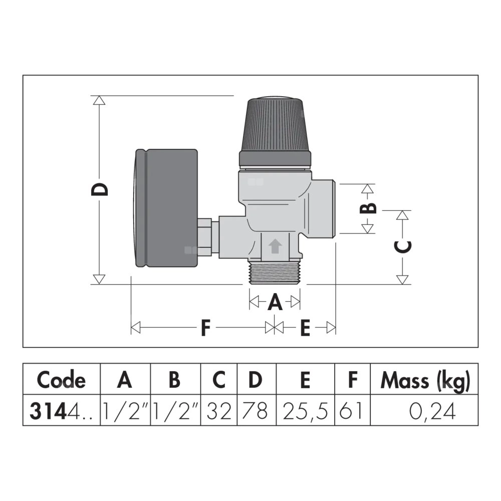 Zawór bezpieczeństwa. Przyłącze z gwintem wewnętrznym z manometrem Ciśnienie otwarcia: + 20% ustawionego Ciśnienie zamknięcia: - 20% ustawionego Przyłącze: G 1/2" A (ISO 228-1) GZ, wlot. Przyłącze: G 1/2" (ISO 228-1) GW, wylot. Zakres temperatury medium: 5–90 °C. Nastawa: 7 bar. PN (Ciśnienie nominalne): PN 10.