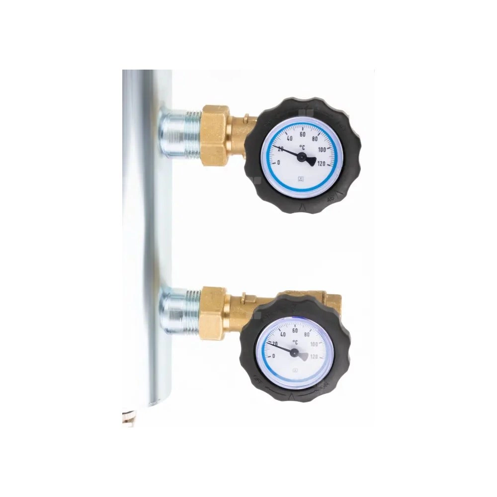 Zawory odcinające ze zintegrowanymi termometrami do kontroli temperatury medium na każdym przyłączu.