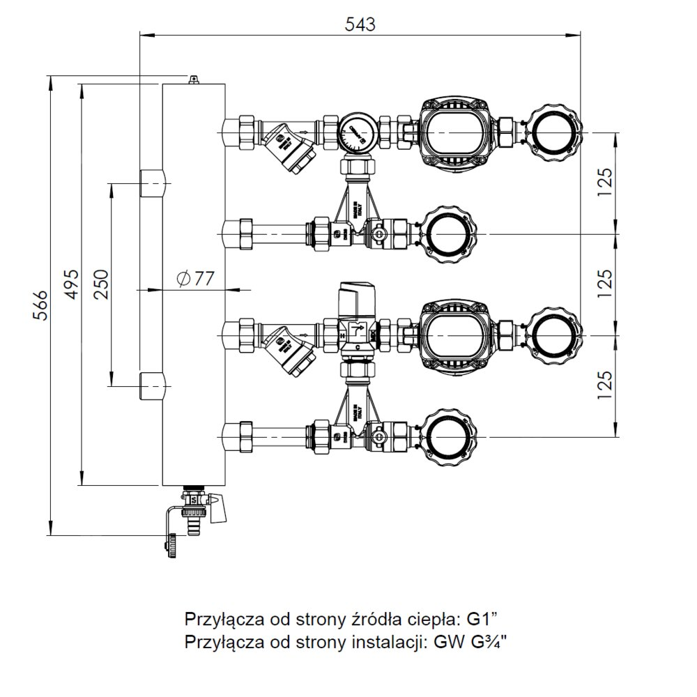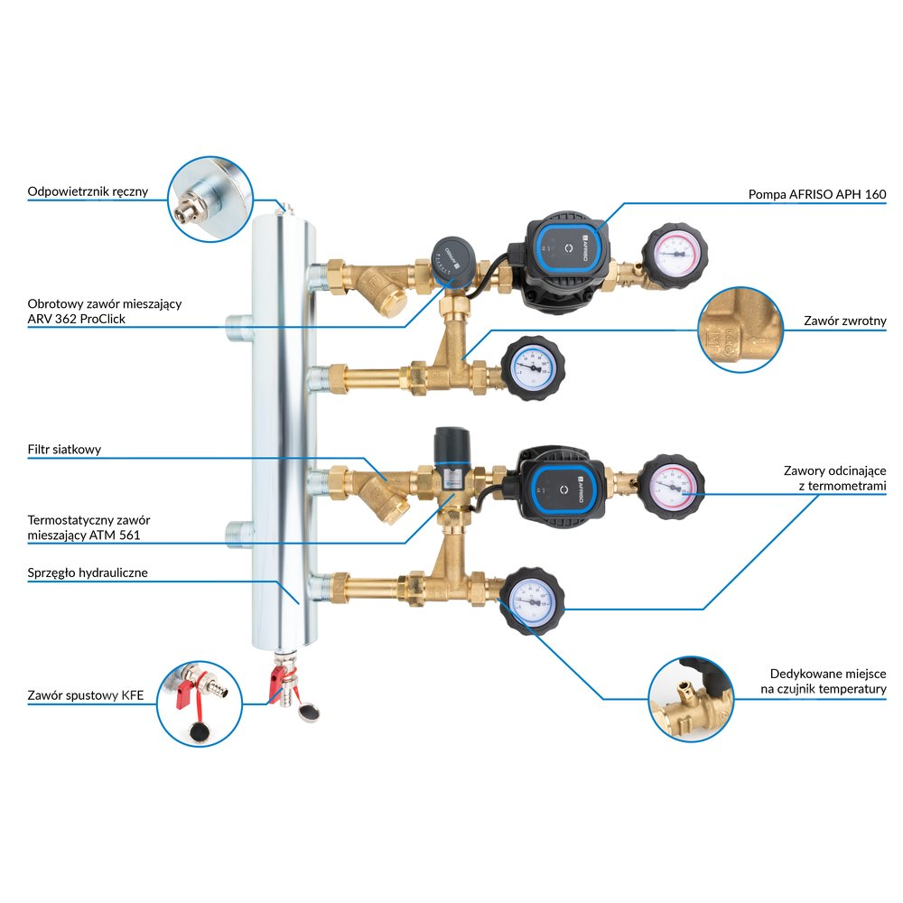 Zawory odcinające ze zintegrowanymi termometrami do kontroli temperatury medium na każdym przyłączu.