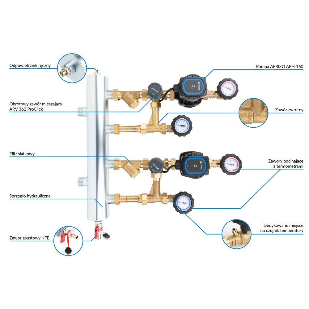 Zawory odcinające ze zintegrowanymi termometrami do kontroli temperatury medium na każdym przyłączu.