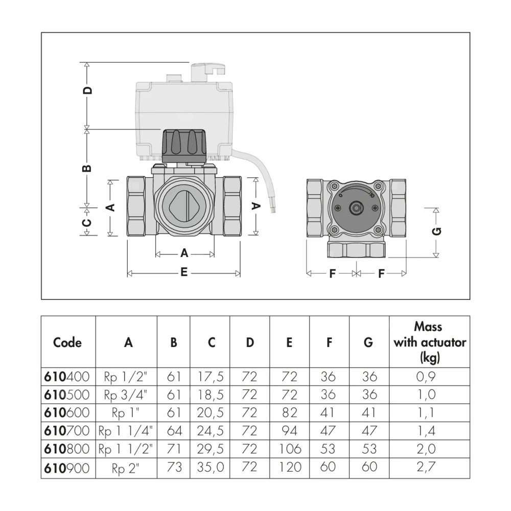 Trójdrożny zawór mieszający, gwintowany Ustawienie fabryczne: zasilanie ze źródła ciepła z prawej strony. Maksymalne ciśnienie pracy: 10 bar. Zakres temperatury medium: 5–110 °C. PN (Ciśnienie nominalne): PN 10. △p max.: 1 bar. Kv: 40 m³/h. Materiał: mosiądz.