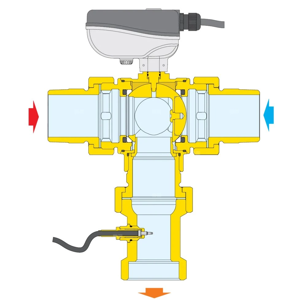 Elektroniczny zawór mieszający z programowalną dezynfekcją termiczną i dezynfekcją kontrolną 24 V. Przyłącza z gwintem zewnętrznym ze złączkami. Z mikroprzełącznikiem pomocniczym Zawiera: - trójdrożny zawór kulowy, - siłownik, - regulator, - czujnik temperatury wody zmieszanej, - czujnik temperatury wody cyrkulacyjnej. Możliwość zdalnego sterowania za pomocą protokołów RS-485 i MODBUS-RTU. Przyłącze: R 1 1/2" (EN 10226-1) GZ, wlot, złączka. Przyłącze: G 1 1/2" (ISO 228-1) GW, wylot. Maksymalne ciśnienie pracy: 10 bar. Zakres temperatury medium: 0–100 °C. Zakres regulacji temperatury: 20–85 °C. Zakres temperatury dezynfekcji: 40–85 °C. Zasilanie elektryczne: 24 V (AC). Pobór mocy: (6,5+6) VA. Stopień ochrony: IP 65. Kv: 32,5 m³/h.