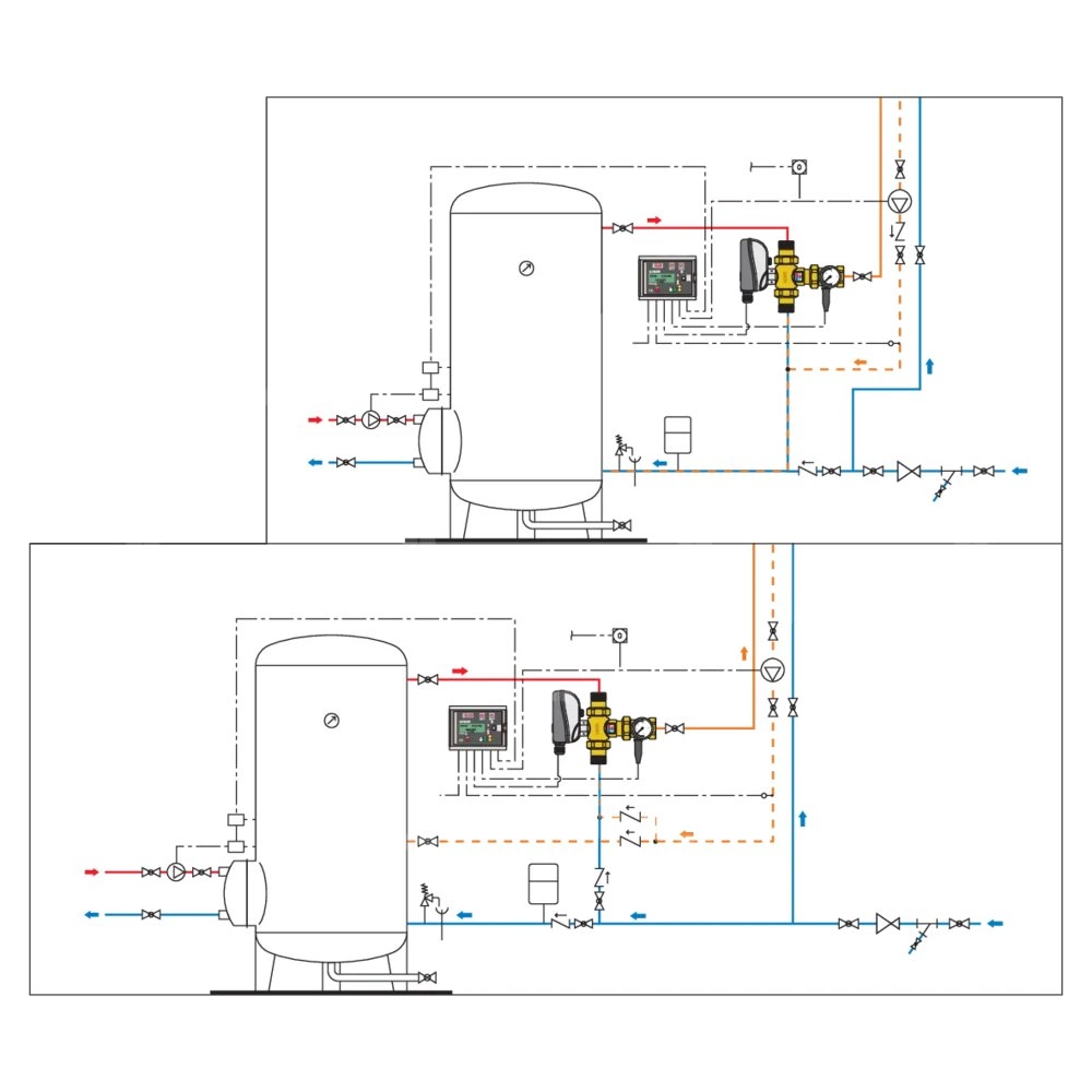 Elektroniczny zawór mieszający z programowalną dezynfekcją termiczną i dezynfekcją kontrolną 24 V. Przyłącza z gwintem zewnętrznym ze złączkami. Z mikroprzełącznikiem pomocniczym Zawiera: - trójdrożny zawór kulowy, - siłownik, - regulator, - czujnik temperatury wody zmieszanej, - czujnik temperatury wody cyrkulacyjnej. Możliwość zdalnego sterowania za pomocą protokołów RS-485 i MODBUS-RTU. Przyłącze: R 1" (EN 10226-1) GZ, wlot, złączka. Przyłącze: G 1" (ISO 228-1) GW, wylot. Maksymalne ciśnienie pracy: 10 bar. Zakres temperatury medium: 0–100 °C. Zakres regulacji temperatury: 20–85 °C. Zakres temperatury dezynfekcji: 40–85 °C. Zasilanie elektryczne: 24 V (AC). Pobór mocy: (6,5+6) VA. Stopień ochrony: IP 65. Kv: 10,6 m³/h.