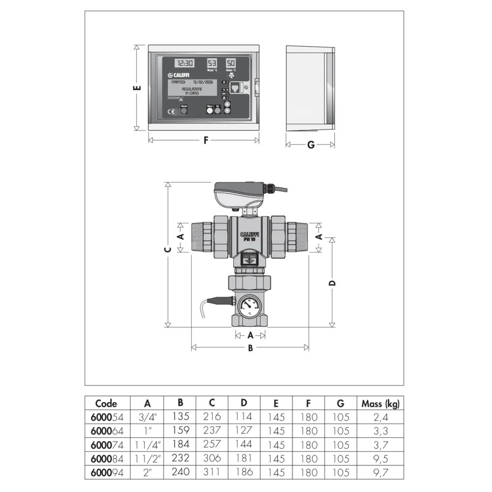 Elektroniczny zawór mieszający z programowalną dezynfekcją termiczną i dezynfekcją kontrolną 24 V. Przyłącza z gwintem zewnętrznym ze złączkami. Z mikroprzełącznikiem pomocniczym Zawiera: - trójdrożny zawór kulowy, - siłownik, - regulator, - czujnik temperatury wody zmieszanej, - czujnik temperatury wody cyrkulacyjnej. Możliwość zdalnego sterowania za pomocą protokołów RS-485 i MODBUS-RTU. Przyłącze: R 2" (EN 10226-1) GZ, wlot, złączka. Przyłącze: G 2" (ISO 228-1) GW, wylot. Maksymalne ciśnienie pracy: 10 bar. Zakres temperatury medium: 0–100 °C. Zakres regulacji temperatury: 20–85 °C. Zakres temperatury dezynfekcji: 40–85 °C. Zasilanie elektryczne: 24 V (AC). Pobór mocy: (6,5+6) VA. Stopień ochrony: IP 65. Kv: 41,0 m³/h.