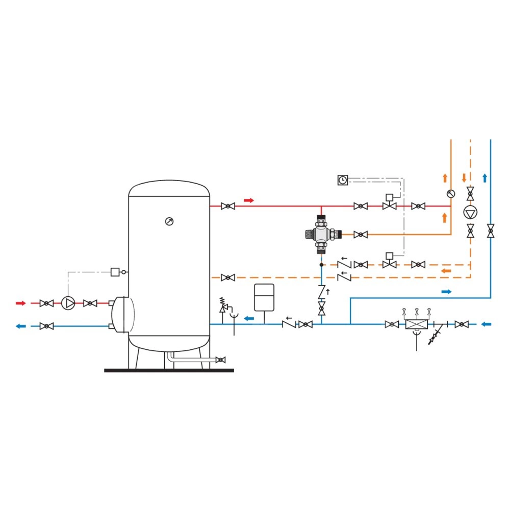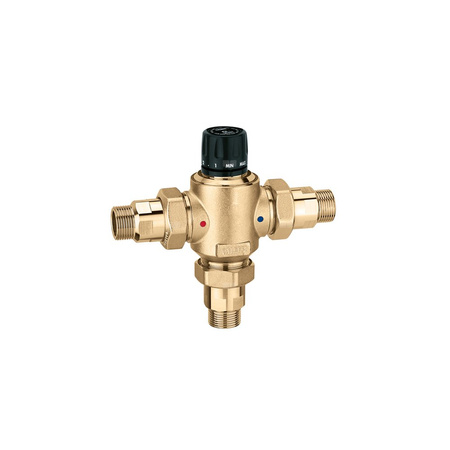 Regulowany termostatyczny zawór mieszający z wymiennym wkładem do systemów scentralizowanych Przyłącze: G 3/4" A (ISO 228-1) GZ. Maksymalne ciśnienie pracy: 14 bar. Zakres temperatury medium: 2–85 °C. Zakres regulacji temperatury: 30–65 °C. Kv: 4,5 m³/h. Materiał: mosiądz.