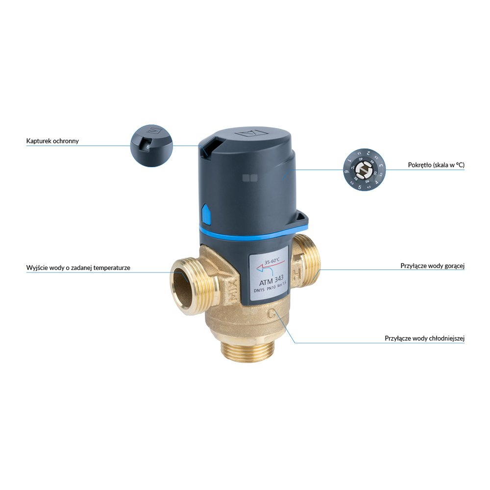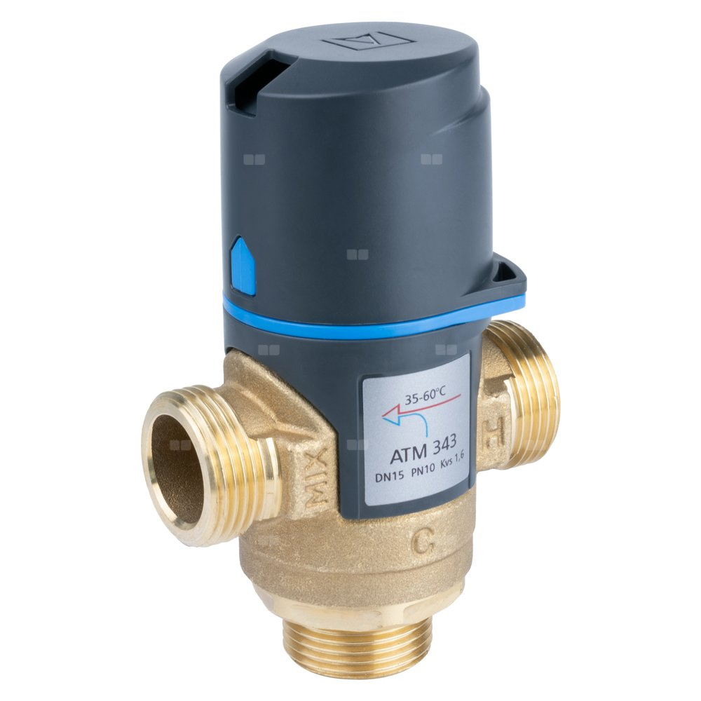 Zawór regulacyjny termostatyczny do wody ciepłej AFRISO ATM 343 mosiądz GZ 3/4'', DN 15, zakres temp. 35-60'C, Kvs 1.6 m3/h, maksymalna temperatura 90'C, maksymane ciśnienie 10 bar