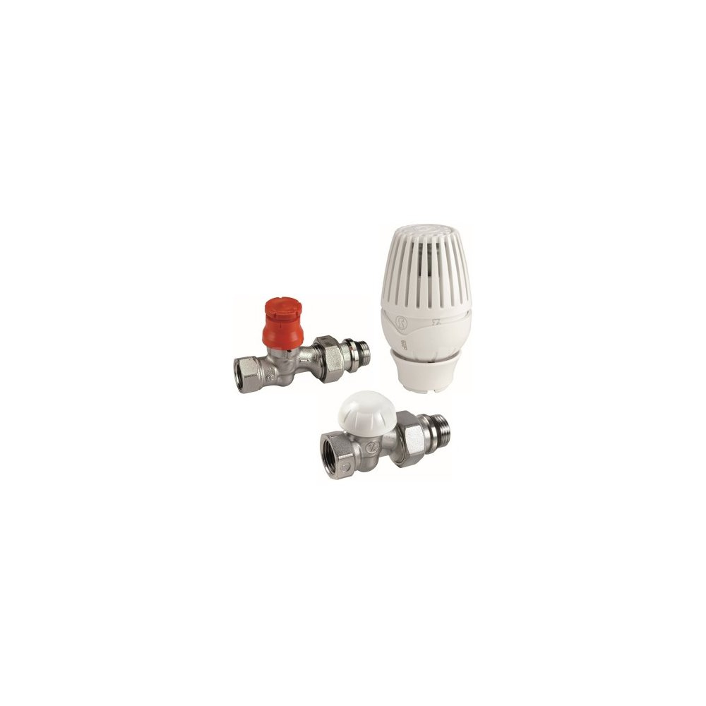 Zestaw termostatyczny do grzałki z nastawą wstępną: głowica termostatyczna, zawór termostatyczny z nastawą wstępną, zawór odcinający. Nie zawiera ogólnego opakowania.