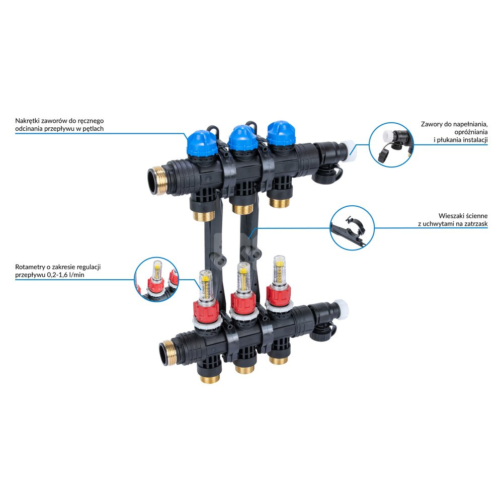 Urządzenie przeznaczone jest do obsługi 3 obiegów grzewczych. Kompletny rozdzielacz składa się z belek zasilającej i powrotnej oraz wieszaków ściennych. Belka zasilająca wyposażona jest w rotametry do regulacji przepływu. Belka powrotna wyposażona jest w zawory do ręcznego zamykania obiegów lub montażu siłowników termoelektrycznych. Obie belki zakończone są zaworami do odpowietrzania, opróżniania, napełniania i płukania instalacji. Do zaworów można podłączyć przyłącza do węża elastycznego. Już posiadany rozdzielacz ProCalida można rozbudować o dowolną ilość sekcji (dzięki rozszerzeniom) oraz o bajpas z zaworem upustowym różnicy ciśnień.