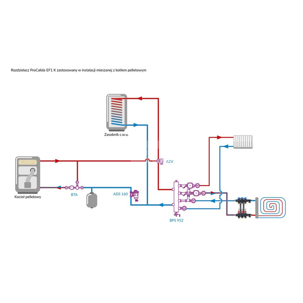 Rozdzielacze poliamidowe ProCalida EF1 K stosuje się w instalacjach ogrzewania lub chłodzenia płaszczyznowego. Montowane są głównie w szafkach umieszczonych w ścianach budynku, skąd rozprowadzają ciepło ze źródła do poszczególnych pętli instalacji płaszczyznowej. Możliwy jest również montaż pod stropem w instalacjach sufitowych. Z ich pomocą reguluje się ilość ciepła kierowaną do konkretnych pomieszczeń, napełnia, opróżnia oraz odpowietrza instalacje płaszczyznowe. Połączone z systemami sterowania FloorControl lub CosiTherm i siłownikami termoelektrycznymi TSA zapewniają stale komfortową temperaturę w każdym z pomieszczeń.