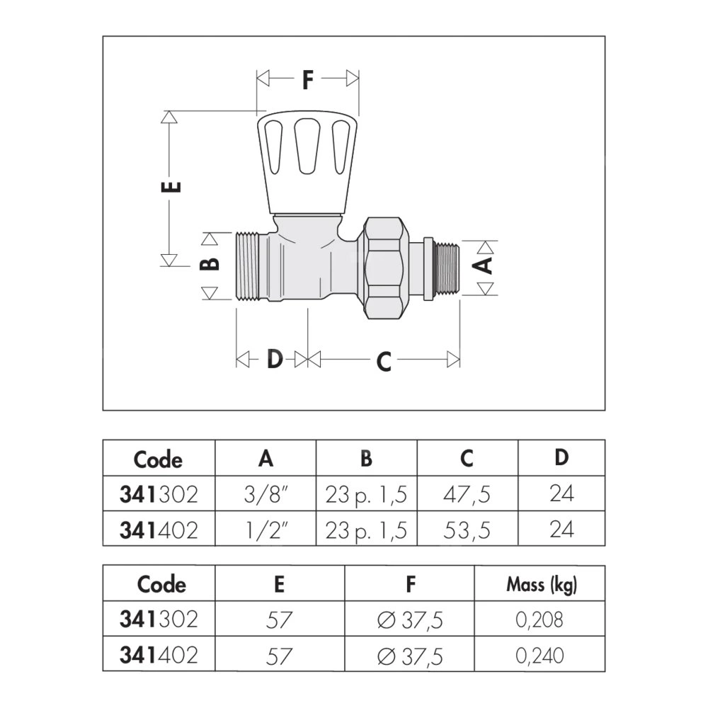 Prosty ręczny zawór grzejnikowy. podłącznie rury: 23 p. 1,5, wlot, podłączenie proste, Podłączenie do złączek Caleffi. podłączenie grzejnika: G 1/2" A (ISO 228-1) GZ, wylot, podłączenie proste. Maksymalne ciśnienie pracy: 10 bar. Zakres temperatury medium: 5–100 °C. Wykończenie: chromowane. Kv: 2,17 m³/h. Materiał: mosiądz.