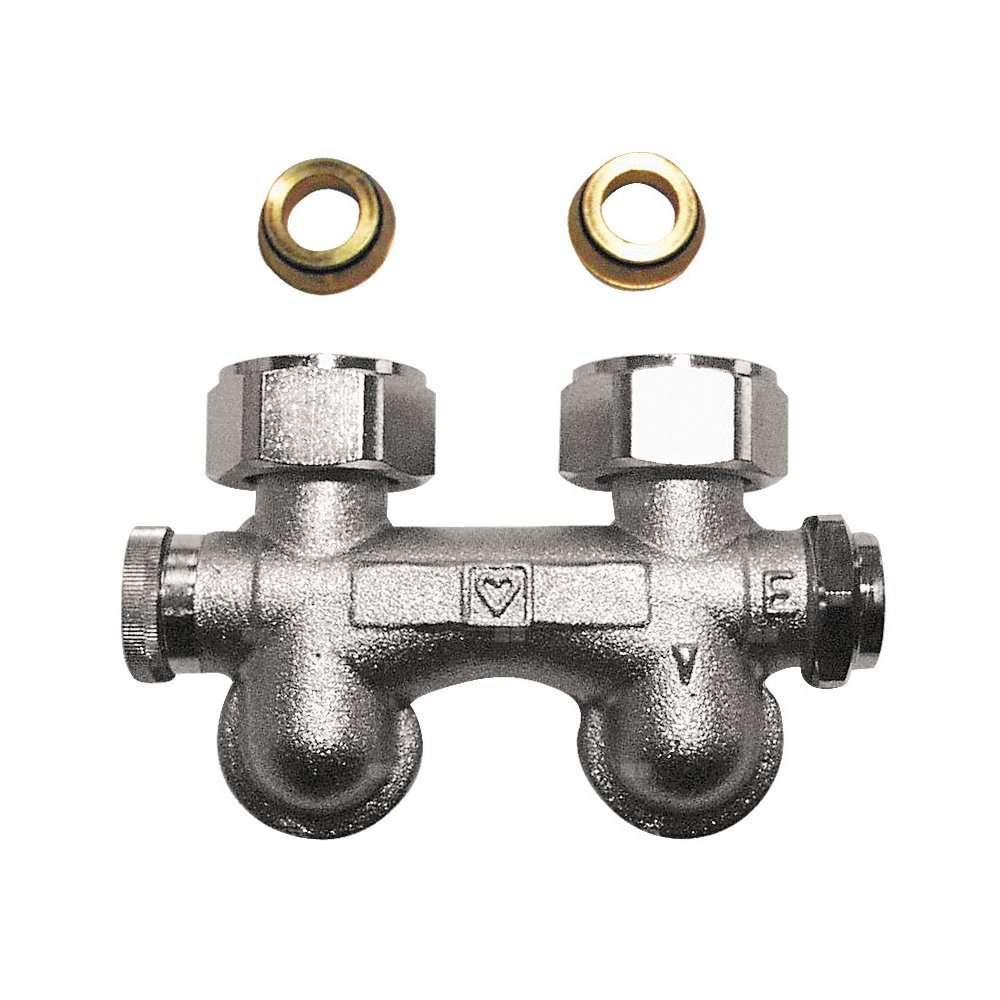 Korpus obejścia HERZ-3000, figura kątowa, spust z prawej strony. Rozstaw króćców przyłączeniowych 50 mm, przyłącze grzejnikowe G 3/4 ze stożkiem, swobodne nakrętki. Przyłącze do rur z gwintem zewnętrznym G 3/4 ze stożkiem do złączy zaciskowych. Złącza zaciskowe oddzielnie do zamówienia.