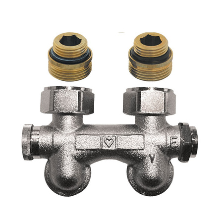 Moduł przyłączeniowy kątowy HERZ 3000 (3066) spust prawy mosiądz (niklowanie) 1/2'' x 3/4'', rozstaw 50 mm do grzejników