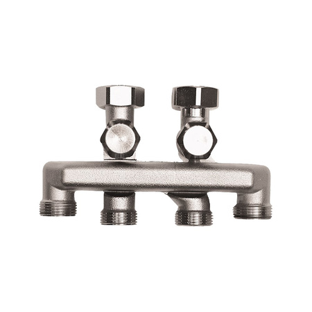 Podwójny symetryczny rozdzielacz przyłączeniowy HERZ. Przyłącze grzejnikowe G 3/4 ze stożkiem, swobodne nakrętki. Przyłącze do rur z gwintem zewnętrznym G 3/4 ze stożkiem do złączy zaciskowych. Złącza zaciskowe oddzielnie do zamówienia.