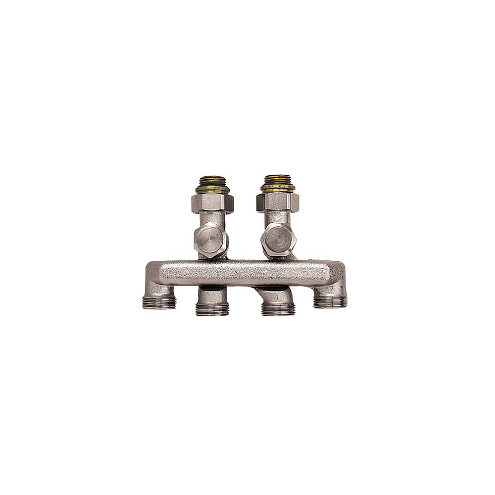 Podwójny symetryczny rozdzielacz przyłączeniowy HERZ. Przyłącze grzejnikowe G 3/4 ze stożkiem, swobodne nakrętki. Przyłącze do rur z gwintem zewnętrznym G 3/4 ze stożkiem do złączy zaciskowych. Złącza zaciskowe oddzielnie do zamówienia.
