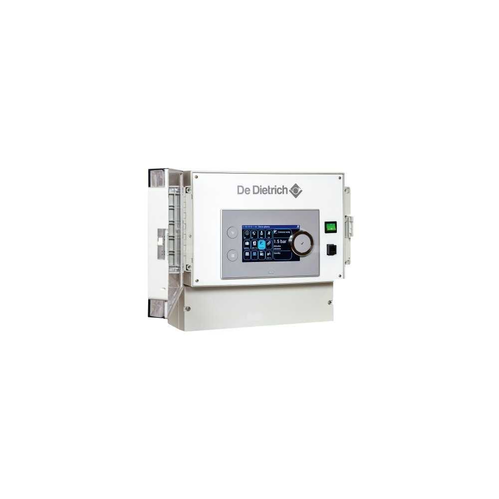 Regulator elektroniczny DIEMATIC VM EVOLUTION, montowany w obudowie naściennej, pozwala sterować i regulować 3 obiegi c.o. oraz 2 obiegi c.w.u. Każdy z tych obiegów grzewczych może być obiegiem bezpośrednim lub z 3-drogowym zaworem mieszającym z siłownikiem.. Można łączyć szeregowo do 8 regulatorów DIEMATIC VM EVOLUTION oraz stosować wiele konfiguracji, zależnie od rodzaju instalacji: - Regulator DIEMATIC VM EVOLUTION może być używany w powiązaniu z Evodens AMC, Innovens Pro MCA 160, Alezio S V200 aby sterować dodatkowymi obiegami c.o. i c.w.u.  - Może być wykorzystany przy połączeniu z jednym lub większą ilością źródeł ciepła wyposażonych w konsolę DIEMATIC EVOLUTION lub IniControl 2 - Może być zintegrowany z DIEMATIC iSystem poprzez Modbus jako "SLAVE" (system wtórny) - Regulator może pracować samodzielnie aby regulować obiegi c.o. i c.w.u. w zależności od temperatury zewnętrznej (czujnik FM46 zamawiany oddzielnie). Regulator może sterować kaskadą kotłów wyposażonych w konsolę DIEMATIC EVOLUTION. DIEMATIC VM EVOLUTION posiada również wejście 0-10V, które może być skonfigurowane jako łącze telefoniczne ON/OFF. Wymiary: długość: 320 mm, wysokość: 260 mm, głębokość: 130 mm. Stopień ochrony: IP 65 - Drzwiczki na zawiasach zamiennych, blokowane i plombowane