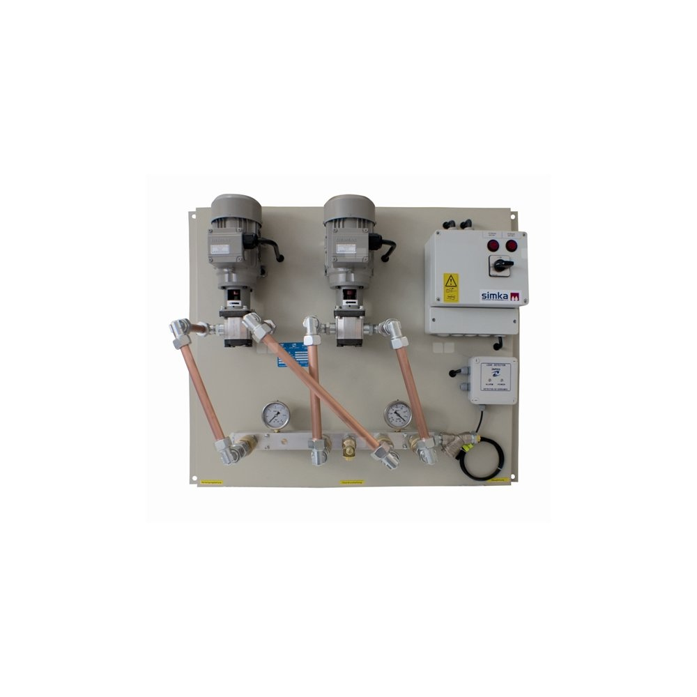Dzięki zastosowaniu układu z dwiema pompami, zwiększamy ich żywotność, jak również zapewniamy nieprzerwaną pracę układu w przypadku awarii jednej z pomp druga sprawna pompa przejmuje pracę po uszkodzonej.