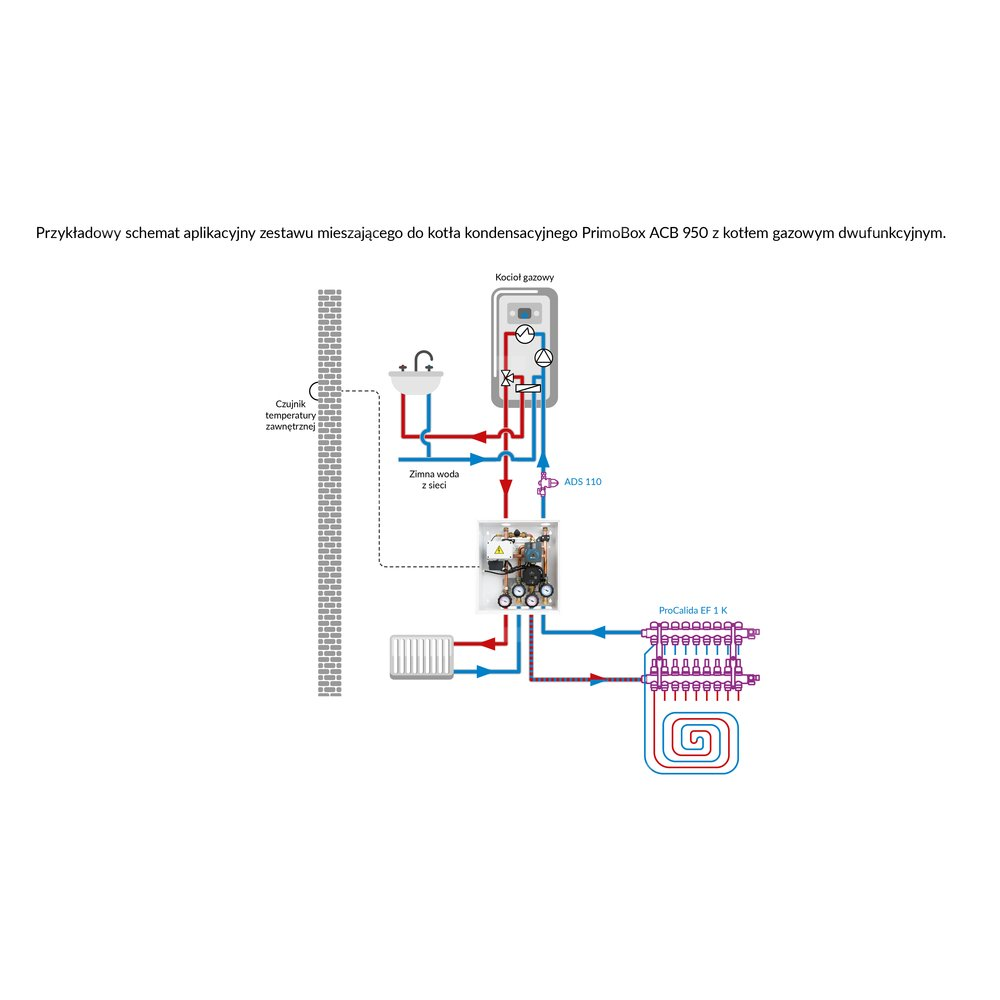 Tworzy dwie strefy ogrzewania o różnych temperaturach zasilania.
