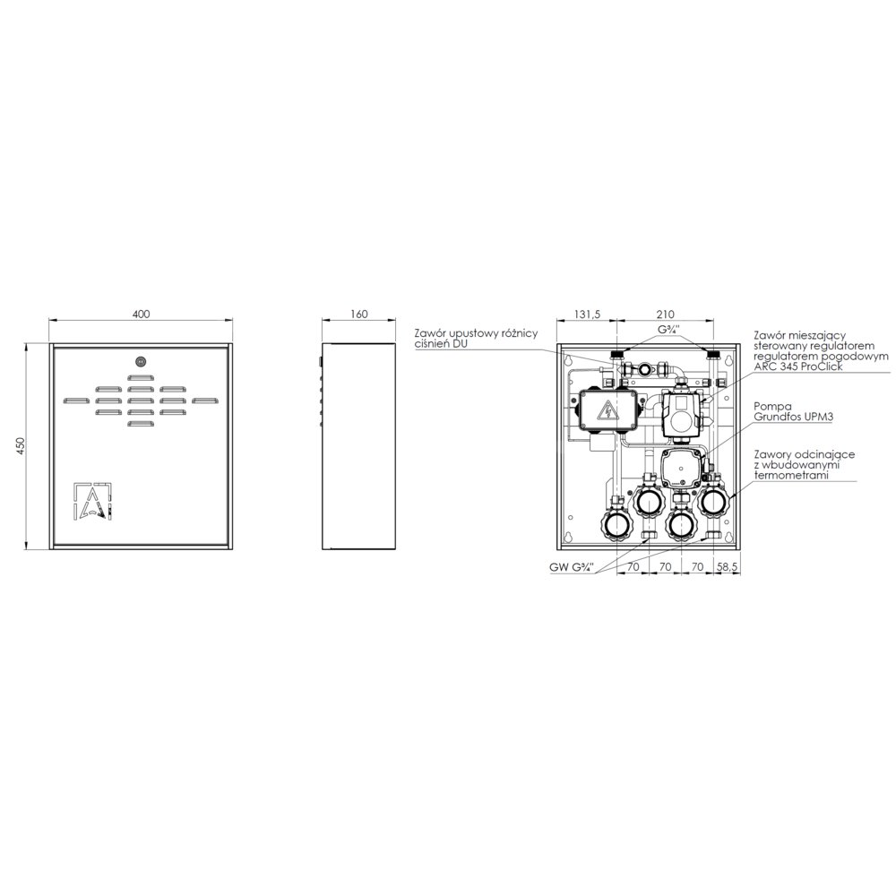 Zawór mieszający oraz pompa obiegowa sterowane są regulatorem pogodowym ARC 345 ProClick, który reguluje temperaturę na podstawie temperatury zewnętrznej i ustawionej krzywej grzewczej.