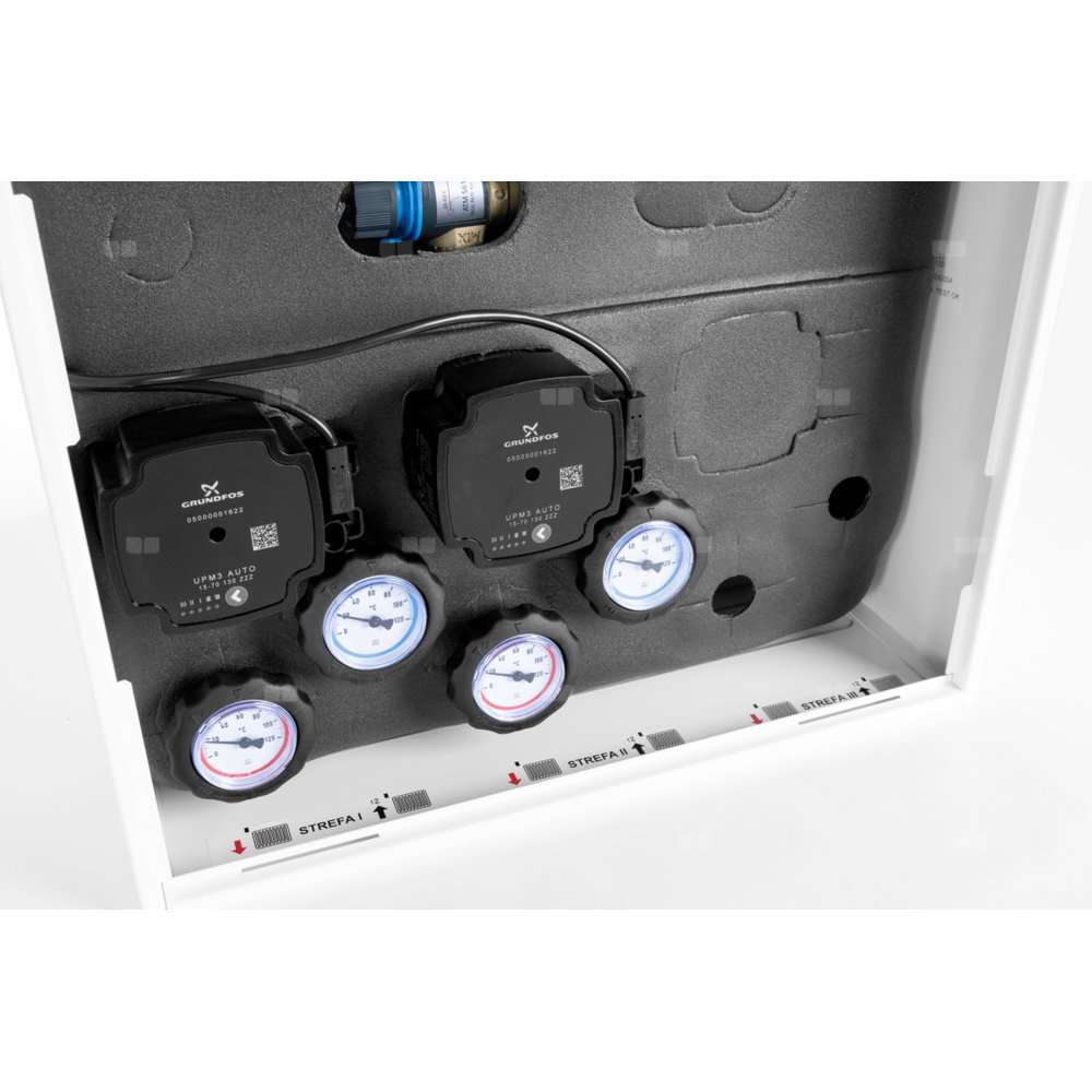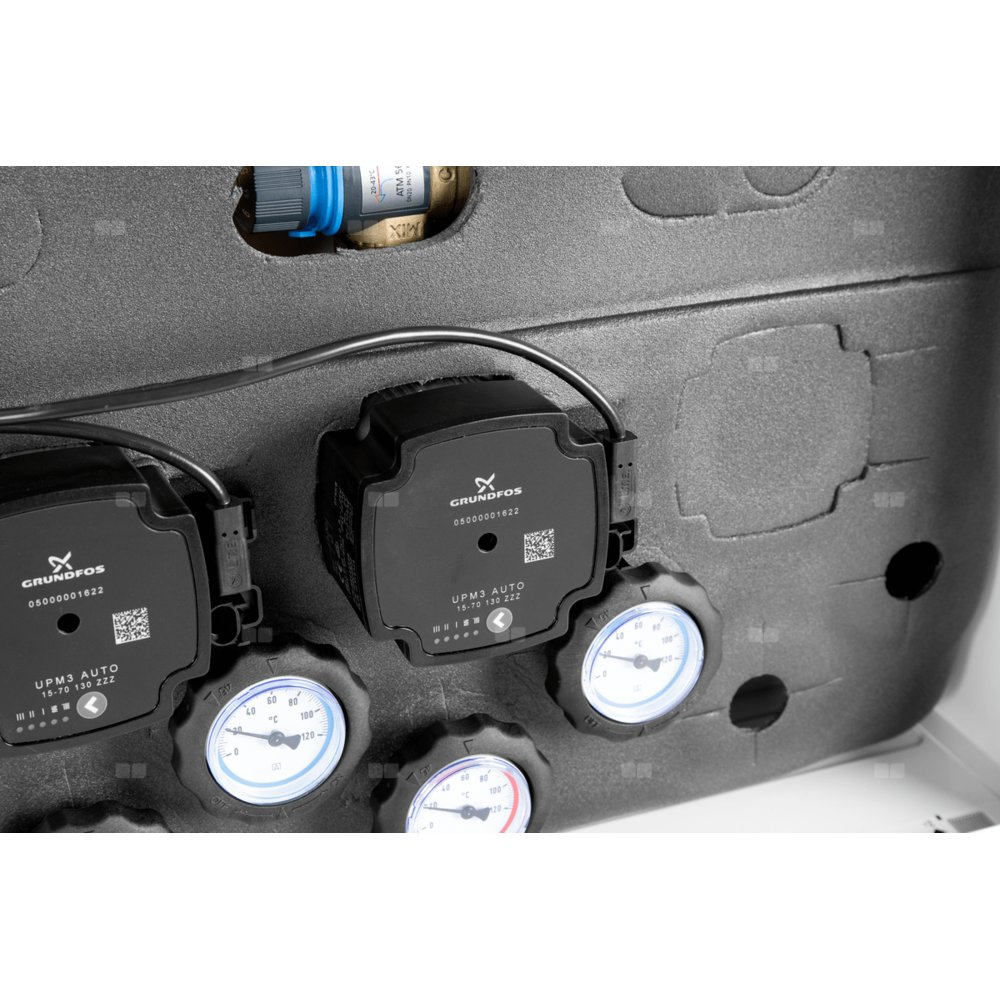 Wyposażony w pompy Grundfos UPm³ i termostatyczny zawór mieszający ATM 561 z regulacją 20 ÷ 43°C. Zakres dobrany na podstawie optymalnych temperatur zasilania instalacji ogrzewania podłogowego.