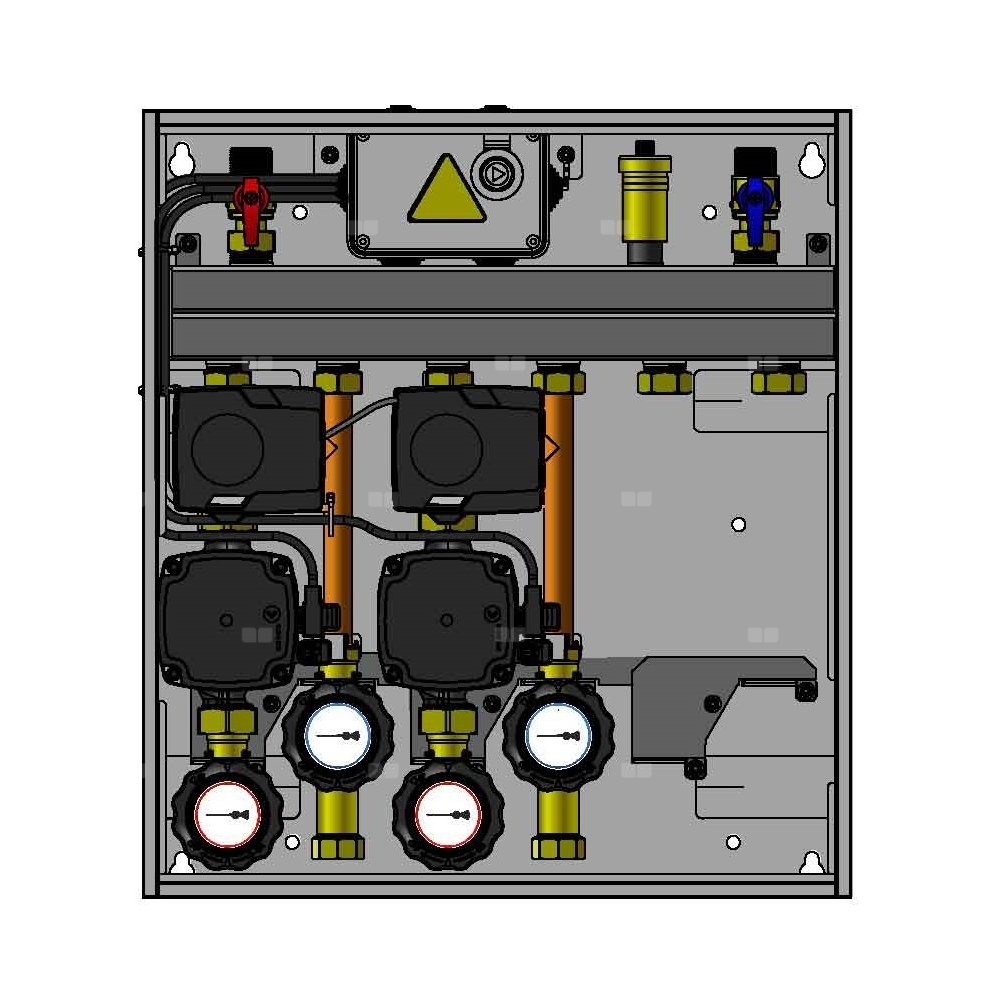 Wyposażony w pompy Grundfos UPm³ i zawory obrotowe z siłownikami elektrycznymi ARM 141.