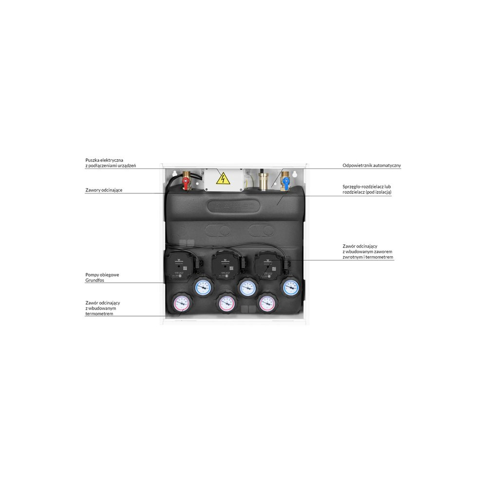 Tworzy 3 obiegi grzewcze w oparciu o wbudowany rozdzielacz ze sprzęgłem hydraulicznym.
