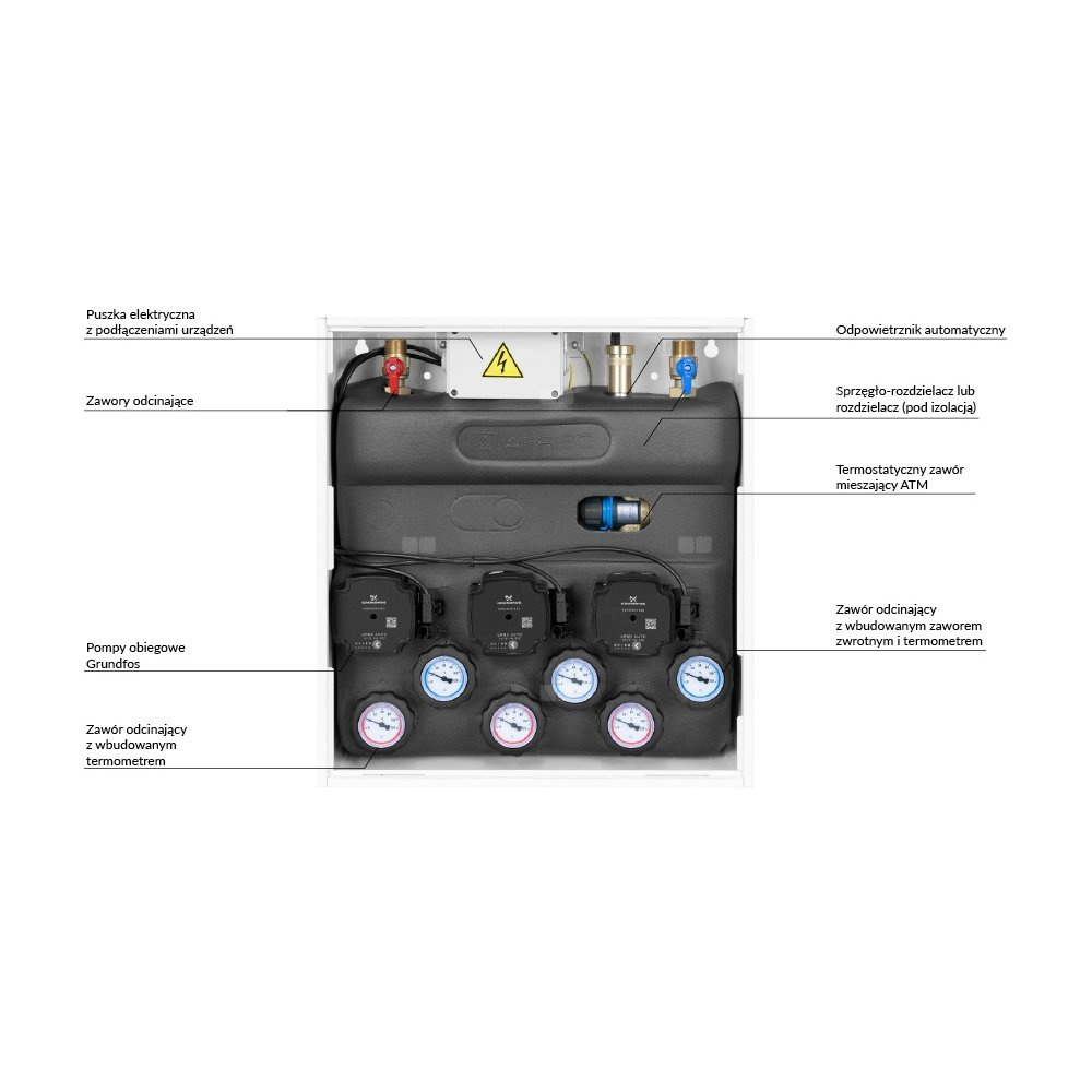 Wyposażony w pompy Grundfos UPm³ i termostatyczny zawór mieszający ATM 561 z regulacją 20 ÷ 43°C. Zakres dobrany na podstawie optymalnych temperatur zasilania instalacji ogrzewania podłogowego.