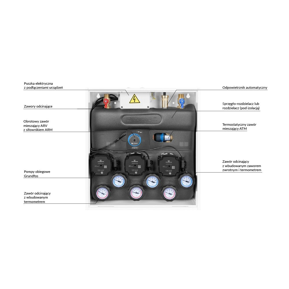 Wyposażony w pompy Grundfos UPm³, zawór obrotowy z siłownikiem ARM 141 oraz zawór termostatyczny ATM 561.